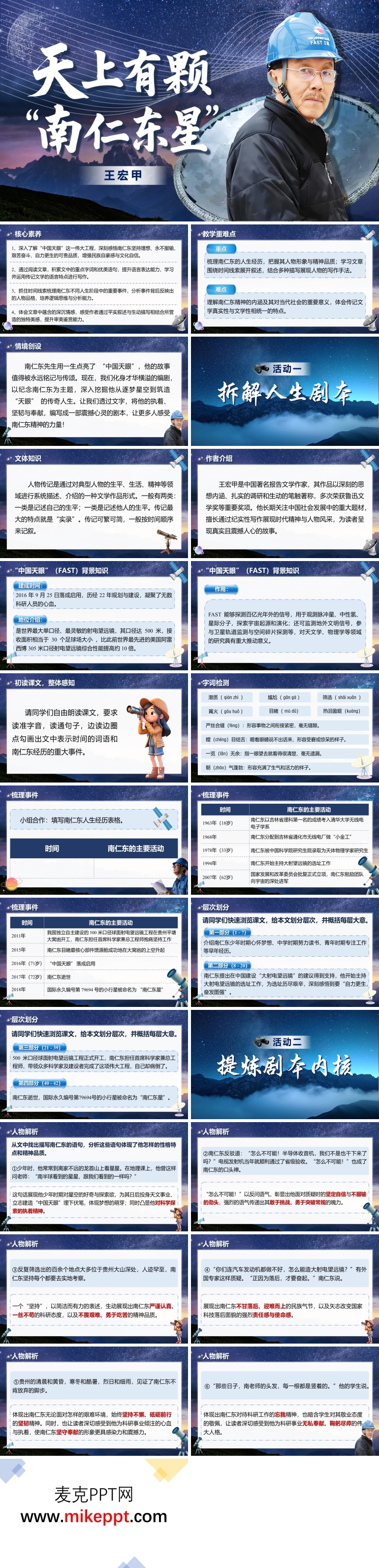 这是一套专为部编版八年级上册《天上有颗“南仁东星”》设计的PPT课件,通过PowerPoint制作,共包含36张幻灯片。南仁东先生用他的一生点亮了中国天眼,为中国乃至世界的科技发展做出了巨大贡献。他对待工作的执着、坚韧与奉献精神,都非常值得我们每个人学习。 这份演示文稿主要从四个部分展开对《天上有颗“南仁东星”》这篇文章的讲解。第一部分是“拆解人生剧本”。在这一部分中,教师首先介绍了本篇文章的文体知识、作者背景,以及中国天眼的背景知识。这些内容不仅帮助学生了解文章的创作背景,还能激发他们对科学探索的兴趣。此外,教师还向学生展示了本篇文章中出现的生字难词,帮助学生积累词汇,为深入理解课文打下基础。 第二部分是“提炼剧本内核”。在这一部分中,教师主要对南仁东先生这个人物进行深入解析,总结他的性格特点和精神品质。通过分析南仁东先生的生平事迹和工作态度,学生能够更好地理解他的执着、坚韧和奉献精神。这一环节不仅帮助学生深入理解人物形象,还能引导他们学习南仁东先生的高尚品质。 第三部分是“研习编剧密码”。在这一部分中,教师引导学生体会本篇文章的写作手法,如选材、结构安排、语言表达等。通过分析这些写作手法,学生能够更好地理解文章的结构和语言特点。此外,教师还鼓励学生进行模仿写作,帮助他们将所学的写作技巧应用到实际写作中,提升写作能力。 第四部分是“提炼精神脚本”。在这一部分中,教师引导学生提炼南仁东先生的精神内涵,总结他对中国科技事业的贡献。通过这一环节,学生不仅能够深入理解南仁东先生的伟大精神,还能将这种精神内化为自己的行动指南,激励自己在学习和生活中不断努力。 通过这四个部分的学习,学生不仅能够全面了解南仁东先生的生平事迹和精神品质,还能提高他们的阅读理解能力和写作能力。这种由浅入深、循序渐进的教学设计,不仅符合八年级学生的认知特点,还能有效激发他们的学习兴趣,使他们在学习中获得知识的同时,也能在思想上得到启发。 复制 重试 分享