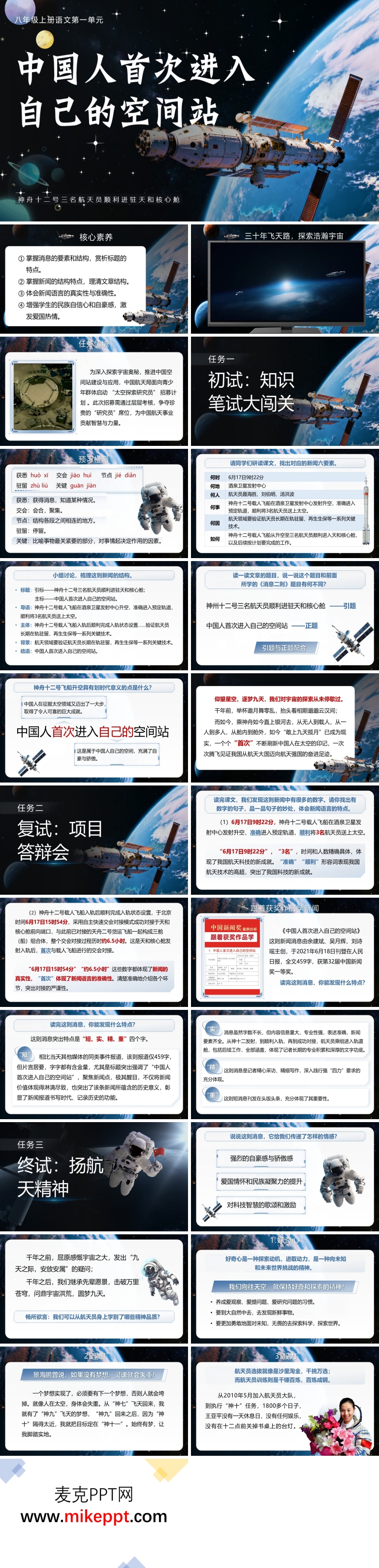 这是一套专为部编版八年级上册《中国人首次进入自己的空间站》设计的PPT课件,通过PowerPoint制作,共包含27张幻灯片。2021年6月17日,我国三名航天员聂海胜、刘伯明、汤洪波乘坐神舟十二号载人飞船首次进入中国自己的空间站,这标志着我国在太空探索领域取得了重大突破,实现了历史性跨越,是全体中国人民的骄傲。这份演示文稿从三个部分对课文进行详细讲解。 第一部分是“知识笔试大闯关”。在这一部分中,教师引导学生对文章进行预习,帮助学生熟悉课文内容。接着,展示文章中的生字难词,并进行详细解释,帮助学生积累词汇。此外,教师引导学生研读课文,找出新闻的六要素(何时、何地、何人、何事、何因、何果),梳理新闻的结构。同时,教师引导学生思考神舟十二号飞船升空具有划时代意义的关键点,帮助学生深入理解这一历史性事件的重要意义。 第二部分是“项目答辩会”。在这一部分中,教师引导学生体会新闻语言的特点,如准确性、客观性、简洁性等。通过分析课文中的具体语句,学生能够更好地理解新闻语言的表达方式。教师还可以通过提问和讨论的方式,帮助学生掌握新闻写作的基本技巧,提高他们的语言表达能力。 第三部分是“扬航天精神”。在这一部分中,教师强调这则消息所传递的情感,引导学生感受航天精神的伟大。通过讨论和分享,学生能够深刻体会到航天员们勇于探索、无私奉献的精神品质,以及我国航天事业取得的巨大成就。这一环节不仅帮助学生理解课文内容,还能激发他们的爱国情感和民族自豪感。 通过这三部分的学习,学生不仅能够全面了解我国航天事业的重大成就,还能提高他们的阅读理解能力和语言表达能力。这种由浅入深、循序渐进的教学设计,不仅符合八年级学生的认知特点,还能有效激发他们的学习兴趣,使他们在学习中获得知识的同时,也能在思想上得到启发。