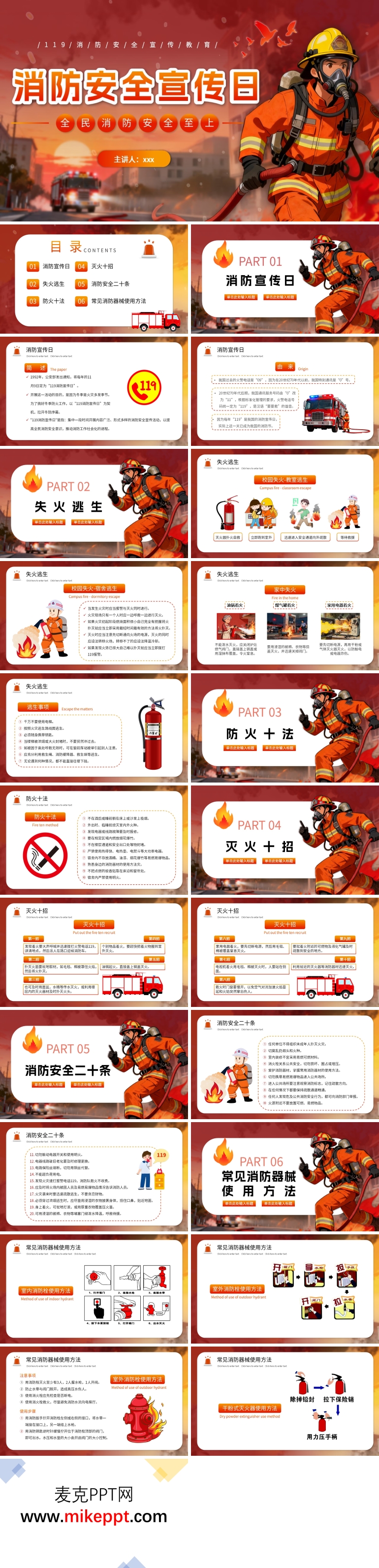 这是一套精心制作的关于消防安全宣传日主题班会的 PPT 模板,采用 PowerPoint 制作而成,总共包含 37 张幻灯片。火灾是一种极具破坏性的灾害,它给人们的生命和财产带来了极其惨重的损失。在火灾发生时,如果人们缺乏正确的应对知识和方法,往往会使后果变得更加严重。因此,掌握消防安全知识对于每个人来说都至关重要。我们不仅要学会预防火灾的发生,还要在面对火灾时能够保持冷静、正确地处理,以最大限度地减少火灾带来的危害。 这份演示文稿内容丰富,主要围绕消防安全宣传日的相关内容展开,共分为六个部分。第一部分是消防宣传日的简述,这部分详细介绍了消防安全日的由来,以及开展这一活动的重要目的,让观众对消防宣传日有初步的了解。第二部分聚焦于失火逃生,针对不同地点发生火灾的情况,详细讲解了相应的逃生方法和注意事项,帮助大家在紧急情况下能够迅速、安全地逃离火灾现场。第三部分介绍了防火十法,通过列举具体的防火措施,引导大家在日常生活中养成良好的防火习惯,从源头上预防火灾的发生。第四部分是灭火十招,为大家提供了在火灾初期可以采取的灭火方法和技巧,让大家能够在火灾初期及时控制火势,避免火势进一步扩大。第五部分展示了消防安全二十条,这些内容涵盖了消防安全的各个方面,是对前面内容的进一步补充和总结,让大家对消防安全有更全面、系统的认识。第六部分是常见消防器械的使用方法介绍,包括室内消防栓、室外消防栓、干粉式灭火器以及二氧化碳灭火器的使用方法,通过详细讲解这些消防器械的使用步骤和注意事项,让大家在遇到火灾时能够正确使用消防器械进行灭火,提高自救和互救的能力。 通过这套 PPT 模板,希望能够让大家更加深入地了解消防安全知识,提高消防安全意识,掌握正确的防火、灭火和逃生方法,共同营造一个安全、和谐的生活环境。