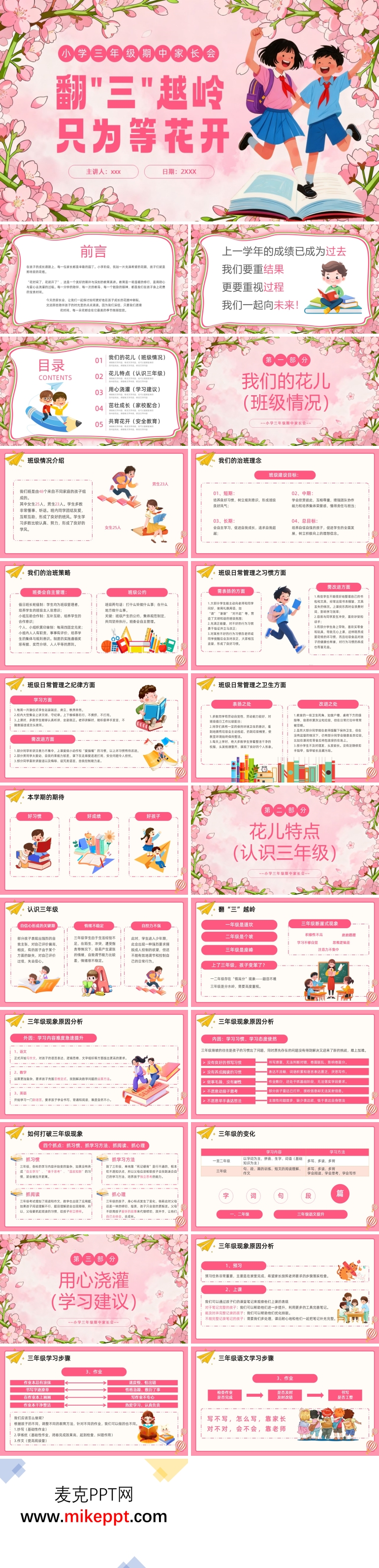 这是一套精心设计的关于“翻三越岭只等开花”三年级期中家长会的 PPT 模板,通过 PowerPoint 制作,包含 45 张幻灯片。在孩子的成长旅程中,家长的角色至关重要。孩子如同一朵花,需要家长的耐心与爱心去悉心浇灌,也需要家长在每一次陪伴和教导中用心养育。家长会是学校与家长之间沟通的重要桥梁,它能够帮助家长更好地了解孩子在学校的学习和生活情况,让家长明白在关注结果的同时,更要重视成长的过程。 这份演示文稿内容丰富,主要从五个部分展开三年级期中家长会。第一部分是“我们的花儿”,在这一部分中,详细介绍了班级的整体情况,包括学生的构成、班级的氛围等。同时,阐述了班级的执班理念,即以何种教育观念来引导学生成长。介绍了执班策略,说明了学校在教育过程中采取的具体方法和措施。在习惯管理方面,强调了良好习惯的养成对学生成长的重要性,并介绍了学校如何帮助学生培养良好的学习和生活习惯。在纪律管理方面,说明了学校如何通过合理的规章制度来维护班级秩序,让学生在一个有序的环境中学习和成长。在卫生管理方面,介绍了学校如何培养学生的卫生意识,保持班级环境的整洁。最后,提出了本学期对学生的期待,包括学习目标、行为规范等方面。 第二部分是“花儿的特点介绍”,主要聚焦于三年级学生的性格特点。三年级是孩子成长过程中的一个重要阶段,他们的性格开始逐渐形成,有自己的想法和主见。这一部分详细分析了三年级学生的心理和行为特点,如好奇心强、活泼好动、喜欢探索等。同时,指出了家长需要着重关注的地方,比如如何引导孩子正确处理学习和玩耍的关系,如何培养孩子的自主学习能力,如何帮助孩子建立良好的人际关系等。通过这些内容,帮助家长更好地理解孩子在这一阶段的心理和行为特点,从而更有针对性地进行教育和引导。 第三部分是“用心浇灌”,这一部分主要针对三年级学生的学习提出了一些建议。学习是孩子在学校的主要任务,这一部分从学习方法、学习习惯、学习态度等多个方面为家长提供了指导。例如,建议家长帮助孩子制定合理的学习计划,培养孩子良好的学习习惯,如按时完成作业、认真听讲、积极思考等。同时,强调了家长在学习过程中的陪伴和鼓励的重要性,鼓励家长多关注孩子的学习过程,而不仅仅是成绩。通过这些具体的建议,帮助家长更好地指导孩子的学习,提高孩子的学习效果。 第四部分是“茁壮成长”,这一部分主要引导家长能够和学校互相配合,共同促进孩子的成长。孩子的成长需要家庭和学校共同努力,这一部分强调了家校合作的重要性。介绍了学校在教育过程中的一些具体做法和计划,同时,也提出了家长可以在家庭中配合学校进行的一些教育活动。例如,家长可以和孩子一起阅读,培养孩子的阅读兴趣;可以和孩子一起参加一些实践活动,拓宽孩子的视野;可以和孩子一起制定家庭规则,培养孩子的自律能力等。通过家校合作,形成教育合力,共同为孩子的成长创造良好的环境。 第五部分是“共育花开”,这一部分主要是安全教育的介绍。安全是孩子成长过程中最重要的保障,这一部分详细介绍了学校在安全教育方面的一些措施和活动。包括校园安全、交通安全、食品安全等方面的安全知识教育。同时,也提醒家长在家庭中也要重视孩子的安全教育,如正确使用电器、注意防火防溺水等。通过学校和家庭的共同努力,提高孩子的安全意识和自我保护能力,确保孩子在安全的环境中健康成长。 通过这套 PPT 模板,希望能够帮助家长更好地了解孩子在学校的学习和生活情况,增强家校之间的沟通与合作。让家长明白在孩子的成长过程中,不仅要关注结果,更要重视过程。通过家长和学校的共同努力,为孩子创造一个良好的成长环境,让孩子像花儿一样茁壮成长,绽放出美丽的花朵。
