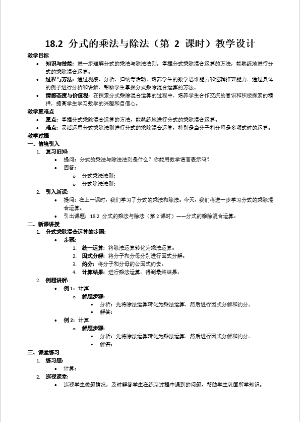 这是一套专为人教版数学八年级上册18.2《分式的乘法与除法(第2课时)》设计的PPT课件,共包含26张幻灯片。本节课的目的是帮助学生理解分式除法法则的推导过程,掌握“除以一个分式等于乘它的倒数”的核心转化方法。通过本节课的学习,学生将进一步培养类比迁移与逻辑推理的能力。 该PPT从八个方面展开本节课程的学习。第一部分是“复习引入”。在这一部分中,教师通过复习上节课的内容,帮助学生巩固分式乘法的法则,为学习分式除法做好铺垫。通过复习,学生能够更好地衔接新旧知识,自然地过渡到本节课的学习主题。 第二部分是“合作探究”。在这一部分中,教师通过设计具体的探究活动,引导学生从分数除法类比到分式除法。通过小组合作和讨论,学生能够积极参与到学习过程中,培养他们的合作能力和探究精神。这一环节不仅帮助学生理解分式除法的概念,还能提高他们的自主学习能力。 第三部分是“典例分析”。在这一部分中,教师通过具体的例题,详细分析分式除法的应用。通过逐步讲解和示范,学生能够更好地掌握“除以一个分式等于乘它的倒数”的核心转化方法,提高解题能力。这一环节通过具体实例,帮助学生将理论知识转化为实际操作能力。 第四部分是“巩固练习”。在这一部分中,教师提供了一系列的练习题,帮助学生巩固所学知识。通过多样化的练习,学生能够加深对分式除法的理解,提高应用能力。这一环节通过大量的练习,帮助学生熟练掌握分式除法的方法。 第五部分是“归纳总结”。在这一部分中,教师通过表格的形式,帮助学生回顾复习本节课的相关知识。通过系统的总结,学生能够清晰地掌握分式除法的概念、方法和步骤,为后续的学习打下坚实的基础。这一环节通过归纳总结,帮助学生梳理知识脉络,巩固所学内容。 第六部分是“感受中考”。在这一部分中,教师通过展示中考真题或模拟题,让学生提前感受中考的难度和题型。通过这一环节,学生能够更好地了解中考的要求,提高应试能力。这一环节通过实际的中考题目,帮助学生将所学知识与考试要求相结合。 第七部分是“小结梳理”。在这一部分中,教师引导学生回顾本节课的重点内容,帮助学生梳理知识脉络。通过小结,学生能够巩固所学知识,加深对分式除法的理解。这一环节通过回顾和梳理,帮助学生系统地掌握本节课的知识点。 第八部分是“布置作业”。在这一部分中,教师布置适量的作业,帮助学生进一步巩固和深化所学知识。通过作业,学生能够独立思考和解决问题,提高数学素养。这一环节通过作业,帮助学生巩固课堂所学,提升自主学习能力。 通过这八个部分的学习,学生不仅能够深入理解分式除法的概念和方法,还能提高他们的数学思维能力和解题能力。这种综合性的教学设计,不仅符合八年级学生的认知特点,还能有效激发他们的学习兴趣,使他们在学习中获得知识的同时,也能在思维上得到提升。