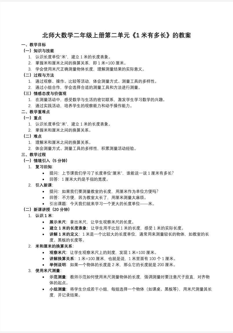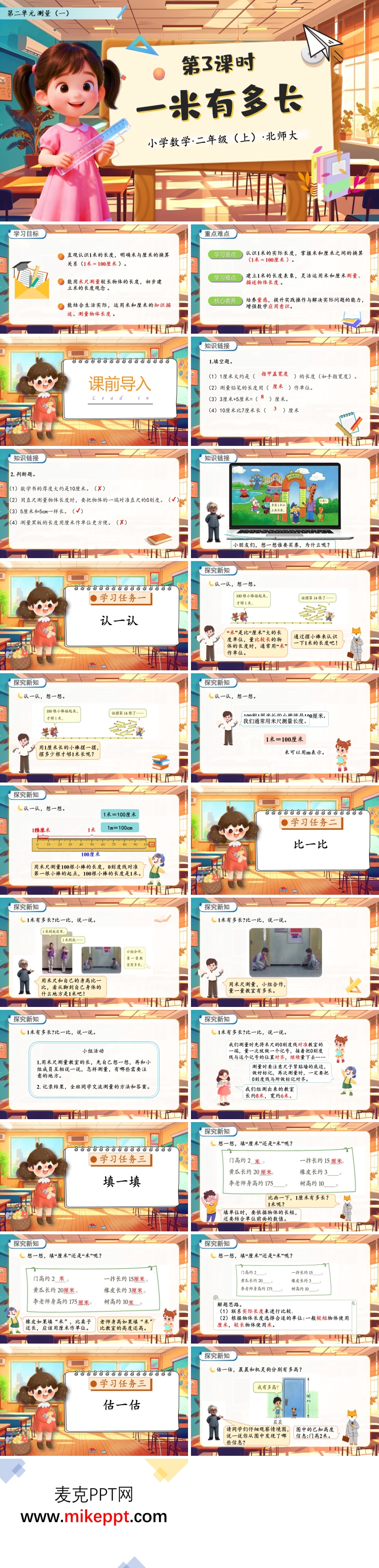 这是一套专为北师大数学二年级上册第二单元设计的《1米有多长》PPT课件,通过PowerPoint制作,包含41张幻灯片。学习长度单位是小学二年级数学的重点内容之一,它不仅为学生后续的数学学习打下坚实基础,还能帮助学生更好地估算不同物体的长度,清晰地界定不同的长度单位。 这份演示文稿从八个部分展开对第二单元第三课时《1米有多长》的教学。第一部分是课前导入,通过引导学生回顾之前学过的厘米这一长度单位,自然地过渡到本节课的学习内容。第二部分是认一认,首先介绍在测量较长物体时通常使用米作为单位,然后通过摆小棒的方式,直观地引导学生认识1米的实际长度,并帮助学生理解米和厘米之间的换算关系。第三部分是比一比,这一部分通过小组合作的方式,让学生用米尺测量教室的长度,并展开讨论,增强学生对米这一单位的感性认识。第四部分是填一填,引导学生根据生活经验和对长度单位的理解,填写适合不同物体的长度单位。第五部分是估一估,培养学生的估测能力。第七部分是量一量,引导学生使用自己喜欢的测量工具测量黑板的长度,并学会用具体的单位来描述测量结果。第八部分是课堂练习、知识总结和课后作业,通过练习巩固所学知识,总结课堂要点,并布置课后作业以加深理解。