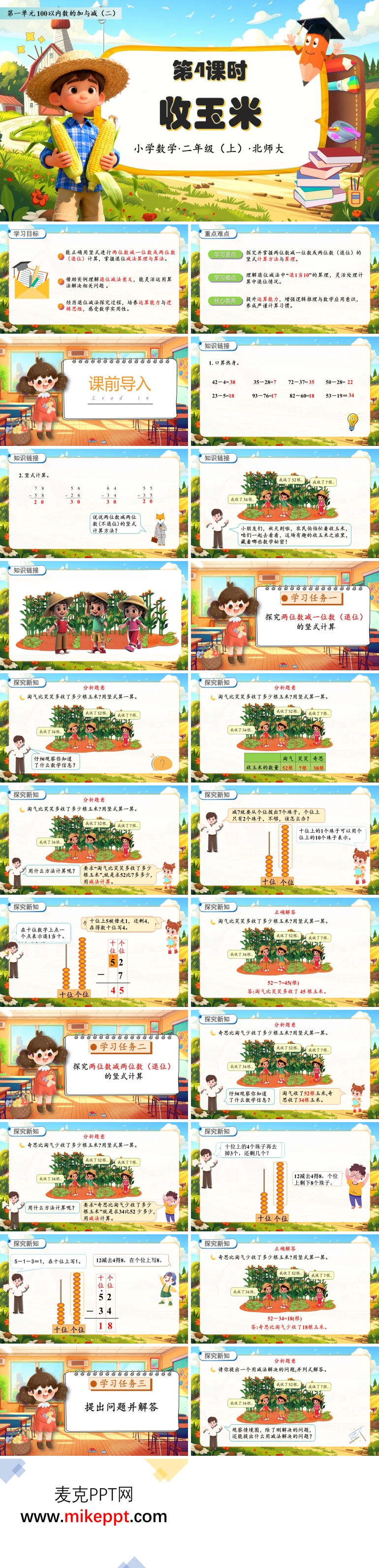 这是一套以“收玉米”为主题的北师大版数学二年级上册第一单元 PPT 课件,通过 PowerPoint 制作,包含 34 张幻灯片。本节课的核心目标是引导学生正确运用竖式进行两位数减一位数或两位数的退位计算,并深刻理解退位减法的算理与算法。 课件内容分为五个部分。在课前导入环节,通过口算热身和复习两位数减两位数不退位的竖式计算方法,帮助学生快速进入学习状态,为后续学习做好铺垫。第二部分聚焦于探究两位数减一位数退位的竖式计算,教师借助直观的串珠操作进行讲解,使学生能够清晰地看到退位的过程,从而更好地理解算理。 第三部分则进一步深入,探究两位数减两位数退位的竖式计算。这一部分继续以“收玉米”这一生动的情境为载体,让学生在具体的情境中感受退位减法的实际应用,通过实际问题的解决,加深对退位减法计算方法的理解和掌握。 第四部分是提出问题并解答。这一环节鼓励学生结合生活实际,提出一个可以用减法解决的问题,并通过列式的方法进行解答。这不仅能够巩固学生对减法计算方法的掌握,还能培养学生的数学思维能力和解决实际问题的能力。 最后一部分是课堂练习、知识总结和课后作业。通过课堂练习,及时巩固所学知识,检验学生的学习效果;通过知识总结,帮助学生梳理本节课的重点内容,加深记忆;课后作业则将学习延伸到课外,让学生在课后进一步巩固和深化知识,培养自主学习能力。