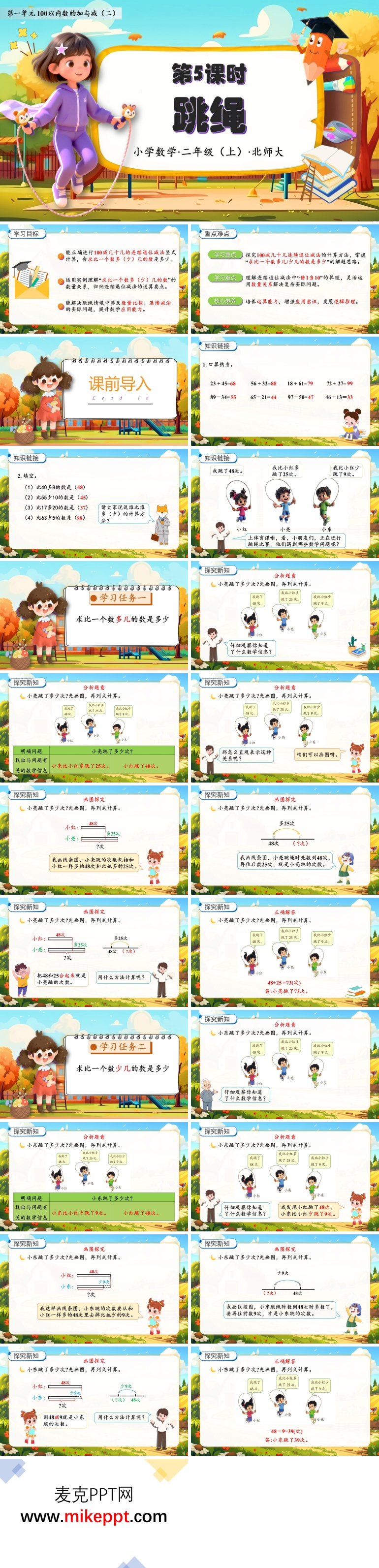 这是一套以“跳绳”为主题的北师大版数学二年级上册第一单元 PPT 课件,通过 PowerPoint 制作,包含 41 张幻灯片。本节课的核心目标是引导学生学习 100 减几十几的连续退位减法的竖式计算方法,掌握求比一个数多多少或少多少的计算方法,并将其运用到实际生活中。 课件内容分为五个部分。在课前导入环节,通过口算热身和填空练习,帮助学生唤醒已有的知识储备,快速进入学习状态,为后续学习做好准备。第二部分聚焦于求比一个数多几的数是多少。这一部分引导学生仔细阅读题目,从题目中提取关键信息,并找出需要解决的问题。教师通过引导学生先画图,再列式计算的方式,帮助学生直观地理解问题,掌握解题方法。 第三部分是对求比一个数少几的数是多少的具体讲解。在这一部分,教师继续采用直观的教学方法,帮助学生理解“少几”的概念,并通过具体的例子和练习,让学生熟练掌握这种类型的计算方法。第四部分是 100 减几十几的连续退位减法的计算方法介绍。这一部分通过详细的步骤讲解和实例演示,帮助学生理解连续退位的计算过程,掌握正确的竖式计算方法。 第五部分是达标练习、知识总结和课后作业。通过达标练习,学生可以及时巩固所学知识,检验学习效果。知识总结环节帮助学生梳理本节课的重点内容,加深对知识的理解和记忆。课后作业则将学习延伸到课外,让学生在课后进一步巩固和深化知识,培养自主学习能力。通过这五个部分的系统学习,学生不仅能够掌握数学计算方法,还能将所学知识应用到实际生活中,提升数学素养。