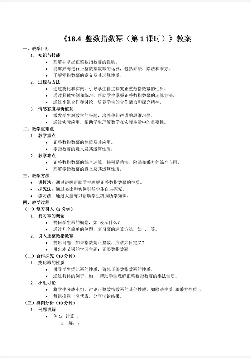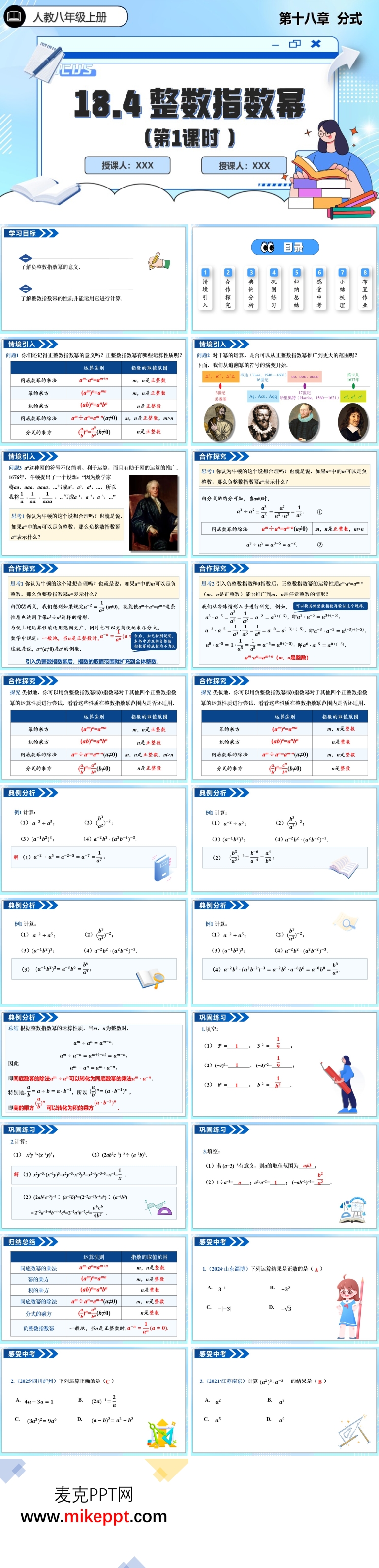 这是一套专为人教版数学八年级上册第18章“整数指数幂”(第1课时)精心设计的PPT课件,包含28张幻灯片。本节课旨在帮助学生深入理解正整数指数幂的性质,熟练掌握正整数指数幂的运算方法,并在自主探究过程中培养学生的合作能力和探究精神。 该PPT课件从八个方面展开教学内容。第一部分是情境引入,通过引导学生回顾复习正整数指数幂的意义及相关运算性质,自然地引出本节课的学习主题,为后续学习奠定基础。第二部分是合作探究,鼓励学生通过小组合作的方式,共同探讨相关问题,培养学生的团队协作能力和自主探究能力。第三部分是典例分析,通过精选的具体例题,帮助学生更好地理解和掌握知识点,提高学生对知识的应用能力。第四部分是巩固练习,通过有针对性的练习题,让学生巩固所学知识,加深对正整数指数幂的理解和运用。第五部分是归纳总结,采用表格的形式,清晰地呈现本节课的重点知识,帮助学生系统地回顾和复习,强化记忆。第六部分是感受中考,展示一些与本节课内容相关的中考题,让学生提前熟悉中考题型,了解中考命题方向,增强学生应对中考的信心。第七部分是小结梳理,对本节课的知识点进行再次梳理和总结,帮助学生构建完整的知识体系。第八部分是布置作业,通过布置适量的作业,让学生在课后进一步巩固所学知识,提高学习效果。