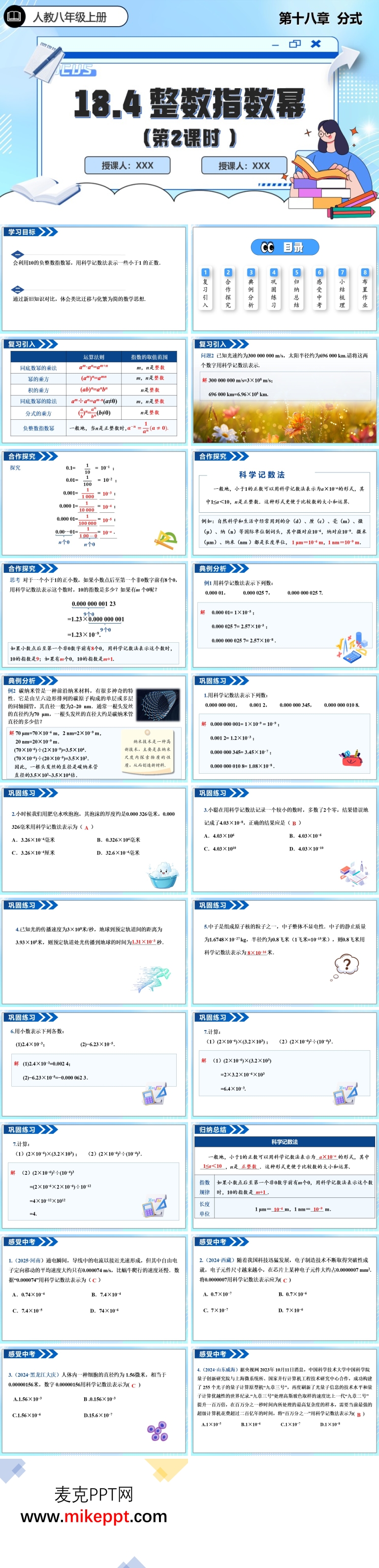 这是一套专为人教版数学八年级上册第18章“整数指数幂”(第2课时)设计的PPT课件,共包含26张幻灯片。本节课的核心目标是帮助学生深入理解负整数指数幂的性质,并熟练掌握其运算方法,包括乘法、除法和乘方。通过本节课的学习,学生将逐步培养严谨的思维习惯,为后续的数学学习打下坚实的基础。 该PPT课件从八个方面展开教学内容。第一部分是复习引入,通过回顾上节课所学的正整数指数幂的知识,自然地过渡到本节课的学习主题,帮助学生建立起知识的连贯性。第二部分是合作探究,鼓励学生通过小组合作的方式,共同探讨负整数指数幂的性质和运算规律,培养学生的团队协作能力和自主探究能力。第三部分是典例分析,通过精选的具体例题,帮助学生更好地理解和掌握负整数指数幂的运算方法,提高学生对知识的应用能力。第四部分是巩固练习,通过有针对性的练习题,让学生在实践中巩固所学知识,加深对负整数指数幂的理解和运用。第五部分是归纳总结,采用表格的形式,清晰地呈现本节课的重点知识,帮助学生系统地回顾和复习,强化记忆。第六部分是感受中考,展示一些与本节课内容相关的中考题,让学生提前熟悉中考题型,了解中考命题方向,增强学生应对中考的信心。第七部分是小结梳理,对本节课的知识点进行再次梳理和总结,帮助学生构建完整的知识体系。第八部分是布置作业,通过布置适量的课后作业,帮助学生及时回顾复习本节课的知识点,加强对知识点的理解和记忆,进一步巩固学习成果。