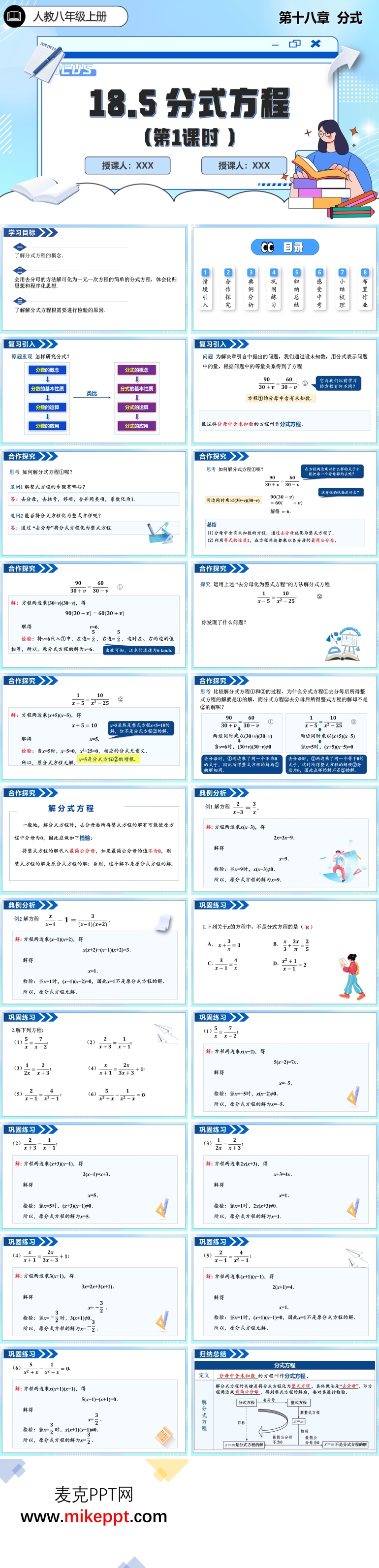这是一套专为人教版数学八年级上册第18章“分式方程”(第1课时)精心设计的PPT课件,共包含31张幻灯片。本节课的核心目标是帮助学生深入理解分式方程的概念,掌握解分式方程的基本步骤,并了解分式方程可能产生增根的原因。通过本节课的学习,学生将被引导自主探究分式方程的解法,同时培养他们的合作能力和探究精神。 该PPT课件从八个方面展开教学内容。第一部分是情境引入,通过创设具体的情境,引导学生回顾已学知识,自然地引出分式方程的概念,激发学生的学习兴趣。第二部分是合作探究,鼓励学生通过小组合作的方式,共同探讨分式方程的解法,培养学生的团队协作能力和自主探究能力。第三部分是典例分析,通过分析具体例题,帮助学生更好地理解和掌握分式方程的解法,提高学生对知识的应用能力。第四部分是巩固练习,通过有针对性的练习题,让学生在实践中巩固所学知识,加深对分式方程的理解和运用。第五部分是归纳总结,采用表格的形式,清晰地呈现本节课的重点知识,帮助学生系统地回顾和复习,强化记忆。第六部分是感受中考,展示一些与本节课内容相关的中考题,让学生提前熟悉中考题型,了解中考命题方向,增强学生应对中考的信心。第七部分是小结梳理,对本节课的知识点进行再次梳理和总结,帮助学生构建完整的知识体系。第八部分是布置作业,通过布置适量的课后作业,帮助学生及时回顾复习本节课的知识点,加强对知识点的理解和记忆,进一步巩固学习成果。