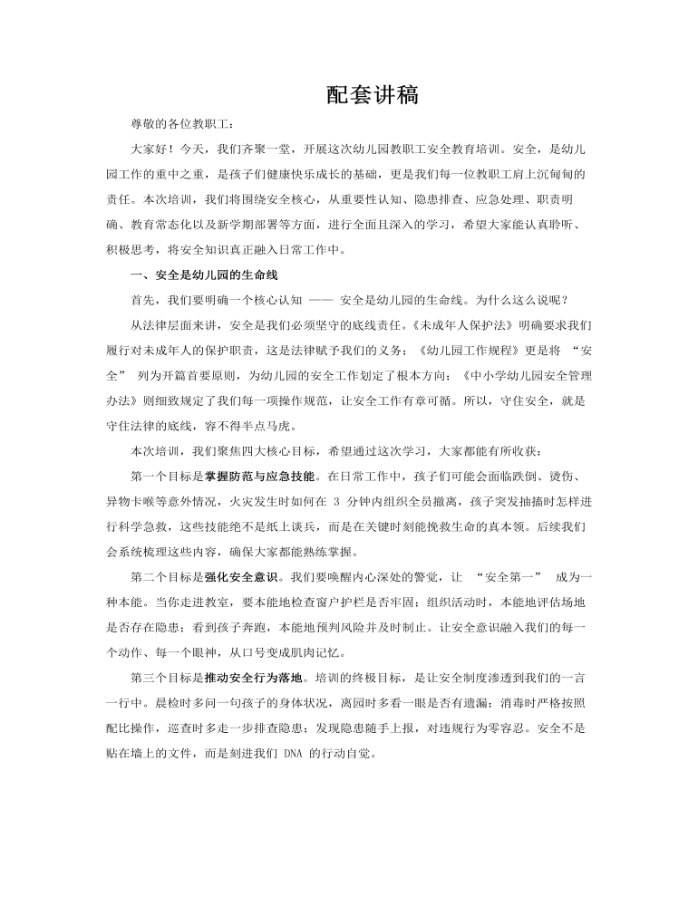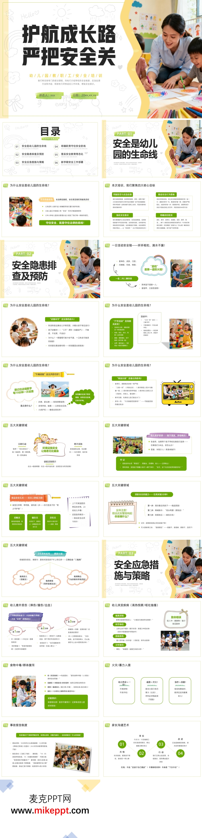 这是一套精心制作的幼儿园教职工安全教育培训PPT课件,共37页,旨在全面提高教职工的安全意识和应急处理能力,确保幼儿园的安全环境。学校是人员密集场所,一旦发生安全事故,后果不堪设想。幼儿园儿童由于年龄小,安全知识相对匮乏,自我保护能力较弱,因此幼儿园的安全工作尤为重要。及时排查安全隐患并进行有效的安全教育,是每个幼儿园的必修课。 PPT课件从六个部分展开幼儿园教职工的安全培训。第一部分强调“安全是幼儿园的生命线”,通过实际案例和深入分析,引导教职工掌握必要的防范与应急技能,推动安全行为的落地生根。同时,强化教职工的安全意识,明确每个岗位的安全职责,确保安全工作责任到人,形成全员参与的安全管理格局。 第二部分聚焦于安全隐患排查及预防。通过详细的图片和具体案例,展示幼儿园中常见的安全隐患,如电器使用、消防通道、食品卫生等,并提供针对性的预防措施。这一部分旨在帮助教职工养成日常检查的习惯,做到防患于未然。 第三部分介绍安全应急措施与策略。当幼儿受伤或突发疾病时,教职工的应急处理能力至关重要。这一部分详细讲解了急救知识,包括常见伤害的处理方法、急救流程以及如何正确拨打急救电话等。通过模拟场景和操作示范,确保教职工能够在紧急情况下迅速、有效地采取行动。 第四部分着重于明确职责,守住安全防线。通过组织架构图和岗位职责说明,清晰界定每个教职工在安全工作中的角色和任务。从园长到教师,从保育员到安保人员,每个人都明确自己的职责,共同构建幼儿园的安全防线。 第五部分强调落实安全教育常态化。安全教育不应是一次性的活动,而应融入幼儿园的日常教学中。这一部分提供了丰富的安全教育资源,如安全故事、儿歌、游戏等,通过趣味性的教学方式,让幼儿在轻松愉快的氛围中学习安全知识,提高自我保护能力。 第六部分是新学期安全工作部署。随着新学期的到来,幼儿园需要对安全工作进行全面规划和部署。这一部分详细介绍了新学期的安全工作计划,包括安全检查的时间表、安全教育的主题安排以及应急演练的计划等,确保新学期的安全工作有序开展。 这套PPT课件内容丰富,实用性强,通过六个部分的系统培训,全面提升了幼儿园教职工的安全意识和应急处理能力。它不仅是一份培训教材,更是幼儿园安全管理的重要工具。通过这套课件,幼儿园能够有效地开展安全教育,为孩子们营造一个安全、健康、快乐的成长环境。