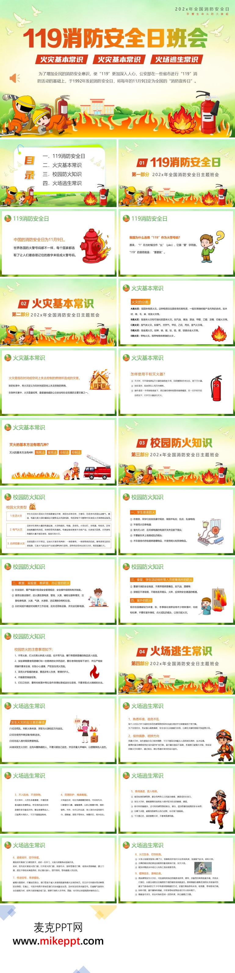 这是一套精心制作的全国消防安全日主题班会PPT,共26页,旨在通过系统的消防安全教育,提高同学们的安全意识和应对火灾事故的能力。消防安全不仅关乎个人的生命财产安全,更是每个人的责任。通过这次班会,同学们不仅能够学习到消防知识,还能将这些知识传递给身边的人,共同构建一个更加安全的环境。 PPT由四个部分组成,内容丰富且实用。第一部分聚焦于119消防安全日的背景。通过介绍中国消防安全日的设立原因,同学们能够深刻理解消防安全的重要性。11月9日的数字“119”与火警电话号码相同,这一天被定为消防安全日,旨在提醒人们时刻关注消防安全,增强防火意识。 第二部分深入讲解火灾基本常识。首先,通过生动的图片和案例,展示了火灾的不同分类,帮助同学们理解不同类型的火灾需要采取不同的应对措施。接着,介绍了火灾的概念,让同学们明白火灾是如何发生的,以及如何在日常生活中预防火灾的发生。最后,详细讲解了灭火的基本方法,包括隔离法、窒息法、冷却法和化学抑制法,并通过动画演示了使用干粉灭火器的正确步骤,确保同学们在紧急情况下能够正确使用灭火器。 第三部分专门针对校园防火知识。校园是同学们学习和生活的重要场所,校园防火至关重要。这一部分首先展示了校园火灾的常见类型,如宿舍火灾、实验室火灾等,并分析了这些火灾发生的原因。接着,详细介绍了校园防火的注意事项,包括正确使用电器、不随意焚烧垃圾、保持消防通道畅通等。通过这些内容,同学们能够更好地了解如何在校园内预防火灾的发生,保护自己和他人的安全。 第四部分是火场逃生常识。在火灾发生时,正确的逃生方法是保护生命的关键。这一部分通过模拟火灾场景,详细讲解了火场逃生的步骤和注意事项。包括如何判断火势、如何选择逃生路线、如何使用湿毛巾捂住口鼻、如何避免吸入有毒烟雾等。通过这些实用的知识,同学们能够在火灾发生时保持冷静,迅速、安全地逃生。 通过这四个部分的系统讲解,这套PPT不仅让同学们掌握了丰富的消防安全知识,还提高了他们的应急处理能力。消防安全教育的最终目标是让每个人都能成为消防安全的传播者和践行者。通过这次班会,同学们能够将所学知识传递给家人和朋友,形成全社会共同关注消防安全的良好氛围。这不仅是一次简单的班会,更是一次生命安全教育的重要契机,让消防安全意识深入人心,共同守护我们的生命财产安全。