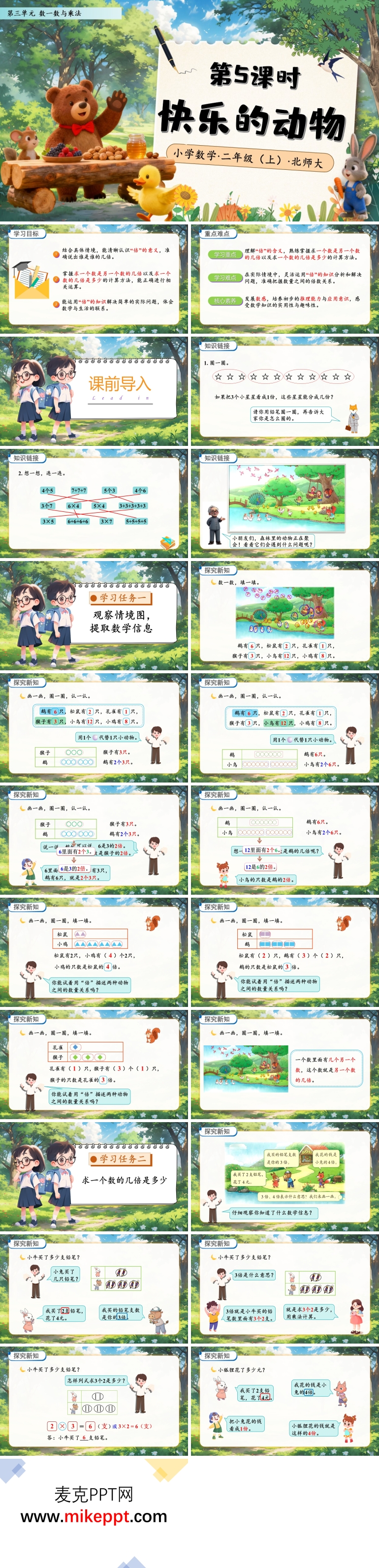 这是一套专为北师大版数学二年级上册第三单元“快乐的动物”设计的PPT课件,共包含35张幻灯片。本节课的核心目标是通过具体情境,帮助学生初步理解“倍”的含义,并经历“倍”的概念形成过程。通过本节课的学习,学生将培养初步的观察分析能力、抽象概括能力及语言表达能力,同时在探索倍数关系的过程中,体验学习的乐趣。 该PPT课件从两个方面展开本节课程的学习。第一部分是“观察情境图,提取数学信息”。这一部分首先让学生观察课本中的情景图,找出相关的数学信息。通过生动的情境图,学生能够直观地看到不同动物的数量关系。接着,通过画一画、圈一圈的方式,学生将初步认识“倍”的概念。例如,通过圈出一组动物的数量,再数出这样的几组,学生能够直观地理解“倍”的含义。这一过程不仅帮助学生建立“倍”的初步概念,还培养了他们的观察力和动手操作能力。 第二部分是“求一个数的几倍是多少?”。这一部分通过具体情境,引导学生通过画图的形式展现倍数关系,并列出相应的算式。例如,如果情境中提到“小兔子的数量是小鸭子的3倍”,学生可以通过画出3组小鸭子的数量来表示小兔子的数量,并列出相应的乘法算式。通过实际操作和讨论,学生将更好地理解如何求一个数的几倍,并能够用乘法解决这类问题。这一过程不仅巩固了学生对“倍”的理解,还提高了他们的数学应用能力。 该套PPT的最后还包括课堂练习环节,通过多样化的练习题,帮助学生加强对知识点的理解和应用。练习题设计注重引导学生归纳总结知识点,通过实际操作和反复练习,学生将能够熟练掌握“倍”的概念及其应用,进一步提高他们的数学能力。 通过这套PPT课件,学生不仅能够通过具体情境初步理解“倍”的含义,还能通过实际操作和练习,培养他们的观察分析能力、抽象概括能力及语言表达能力。在探索倍数关系的过程中,学生将体验到学习的乐趣,为后续的数学学习打下坚实的基础。
