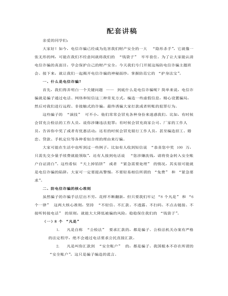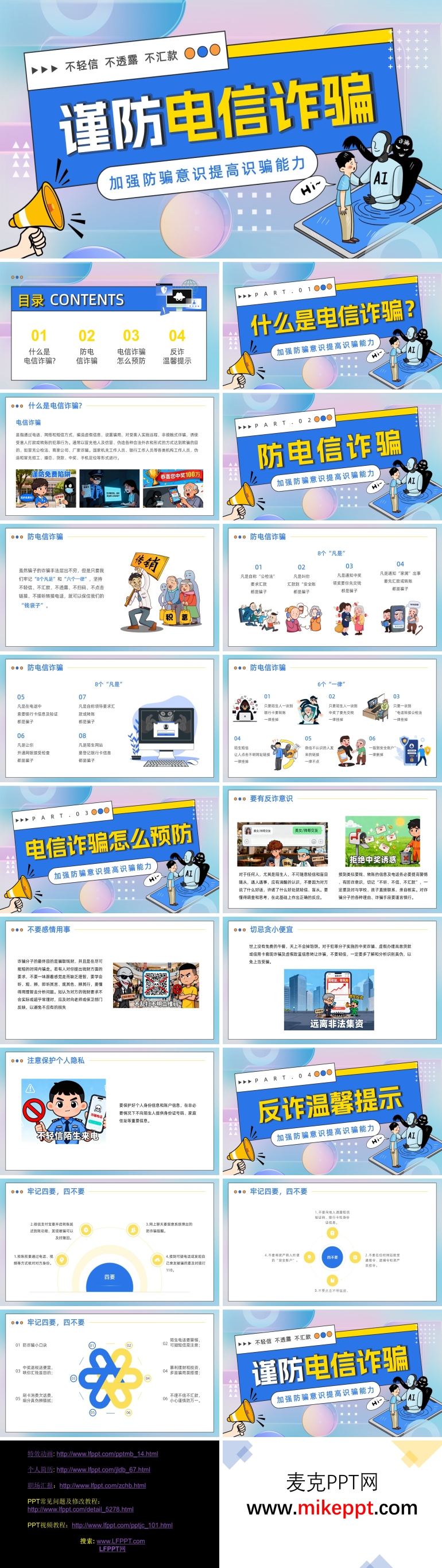 这是一套精心设计的全国防诈骗宣传日防电信诈骗主题班会PPT课件,共包含19张幻灯片,内容全面且实用,旨在通过生动的讲解和实用的建议,帮助人们提高防电信诈骗的意识和能力。 课件内容概述 第一部分:认识电信诈骗 这一部分首先通过文字详细介绍了电信诈骗的定义,帮助观众理解电信诈骗的本质。接着,列举了多种常见的电信诈骗手段,如冒充公检法人员、商家公司、厂家等进行诈骗。这些手段往往利用人们的信任和恐惧心理,通过电话、短信、网络等方式实施诈骗。通过这部分内容,观众可以清晰地认识到电信诈骗的多样性和危害性,从而增强自身的防骗意识。 第二部分:防范电信诈骗 在这一部分,PPT详细讲述了如何防范电信诈骗。观众需要牢记“八个凡是”和“六个一律”这两个重要的防骗口诀。这些口诀简洁明了,易于记忆,能够帮助人们在面对诈骗时迅速做出判断。具体来说,不轻信陌生人的电话和信息,不随意汇款,不透露个人信息,不扫描不明二维码,不点击可疑链接,不接听转接电话等,这些措施可以有效保护个人的财产安全。 第三部分:预防电信诈骗的策略 这一部分着重介绍了预防电信诈骗的具体策略。首先,观众需要树立强烈的反诈意识,保持冷静,不被感情左右。其次,要切忌贪小便宜,避免因小利而陷入诈骗陷阱。此外,注重保护个人隐私也至关重要,不随意泄露个人信息,如身份证号码、银行卡号、密码等。通过这些策略,观众可以更好地预防电信诈骗,保护自己的财产和信息安全。 第四部分:反诈温馨提示 最后,PPT提供了反诈温馨提示,通过一些生动的案例和实用的建议,进一步提醒观众在日常生活中保持警惕。这些温馨提示包括但不限于:定期更新防病毒软件,不随意连接公共Wi-Fi,不随意下载不明来源的软件等。这些细节虽然看似简单,但在实际生活中却能有效降低被诈骗的风险。 总结 这套PPT课件内容丰富,形式多样,通过详细的讲解和实用的建议,帮助观众全面了解电信诈骗的手段和危害,掌握防范和预防电信诈骗的方法。无论是学校、社区还是企业,都可以利用这套PPT开展防电信诈骗教育活动,提高公众的防骗意识和能力,共同构建一个安全、和谐的社会环境。