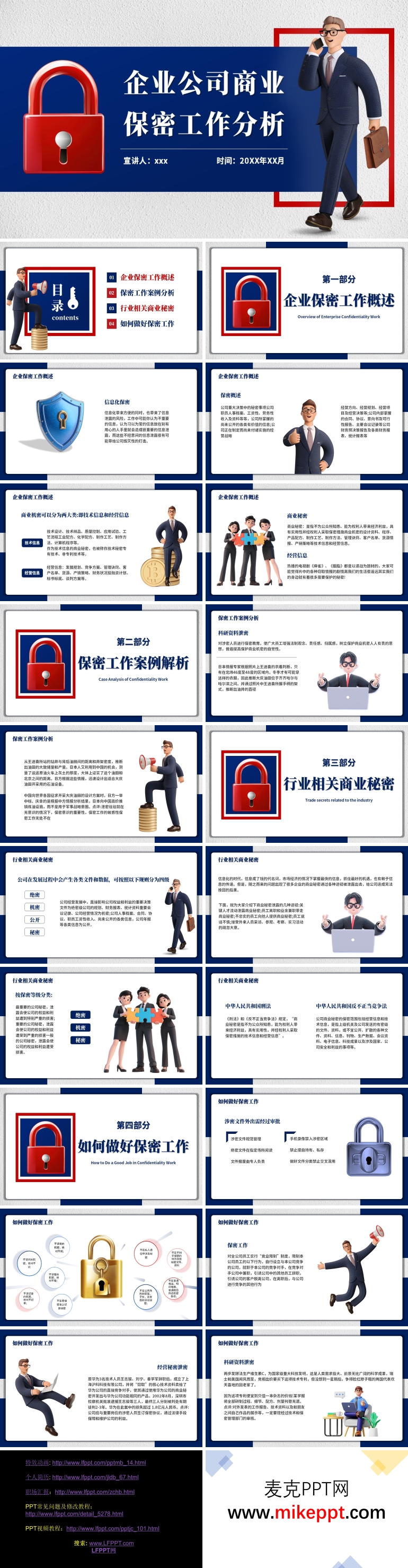 这是一套精心制作的企业保密培训PPT课件,通过PowerPoint设计,共包含21张幻灯片。在当今信息快速传递的时代,虽然工作变得更加高效,但信息泄露的风险也随之增加。例如,将重要信息不慎保存在他人设备上,可能会给企业带来严重损失。因此,企业保密工作至关重要。 课件内容概述 第一部分:企业保密工作概述 这一部分首先介绍了保密工作的基本概念,强调了保密在企业运营中的重要性。商业机密主要分为技术信息和经营信息两大类。技术信息包括研发成果、专利、技术图纸等,而经营信息则涵盖市场策略、客户名单、财务报表等。这些信息一旦泄露,可能会导致企业在市场竞争中处于劣势,甚至遭受重大经济损失。 第二部分:保密工作案例解析 通过具体案例,这一部分展示了科研资料泄密的严重后果。案例中,一位科研人员在不经意间将重要资料保存在他人设备上,导致信息泄露。这个案例生动地说明了泄密往往发生在无意识的情况下,因此员工必须提高保密意识,避免因疏忽大意而给企业带来不必要的风险。 第三部分:行业相关商业秘密的介绍 这一部分详细介绍了企业在发展过程中可能产生的各类文件和数据,并根据其重要性和敏感性将这些信息分为四个等级:绝密、机密、秘密和公开。绝密信息是企业最核心的机密,如关键技术、核心客户名单等;机密信息则涉及重要的经营策略和财务数据;秘密信息包括一般性的内部文件和数据;公开信息则是可以对外公布的内容。通过明确信息的等级,企业可以更有针对性地采取保密措施。 第四部分:如何做好保密工作 这一部分重点介绍了做好保密工作的行为和方法。首先,员工需要树立强烈的保密意识,认识到保密工作的重要性。其次,企业应制定完善的保密制度,明确保密责任和流程。此外,还应加强技术防护措施,如使用加密软件、限制数据访问权限等。同时,定期开展保密培训,提高员工的保密技能和应对能力。最后,企业应建立监督和评估机制,确保保密措施的有效执行。 总结 这套企业保密培训PPT课件内容全面、实用,通过生动的案例和具体的指导方法,帮助员工深刻理解保密工作的重要性,并掌握有效的保密措施。无论是新入职员工还是资深员工,都可以通过这套课件提升自身的保密意识和能力,共同守护企业的核心机密,确保企业在激烈的市场竞争中保持优势。