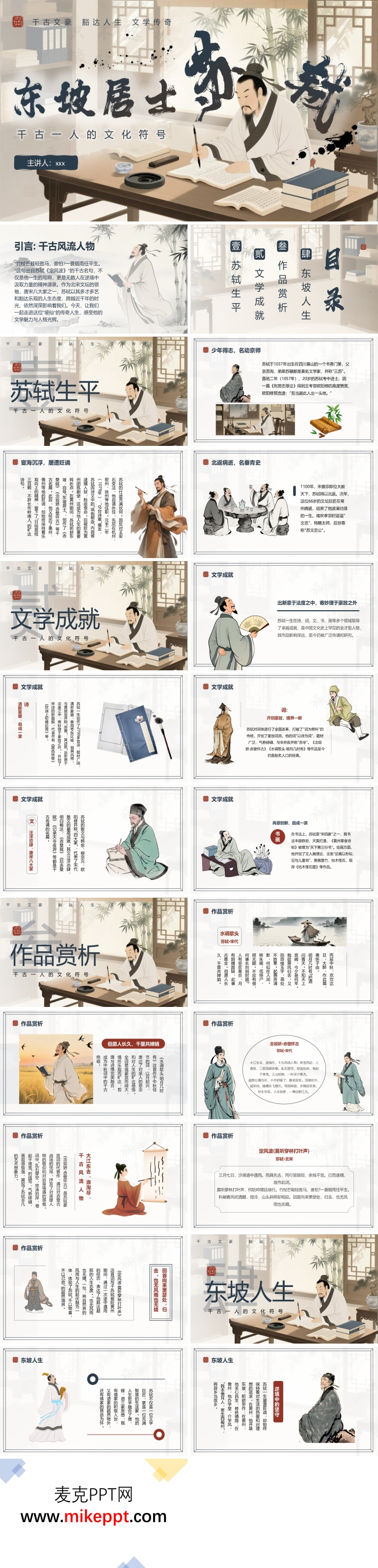 以下是一套关于东坡居士苏轼人物介绍的 PPT 课件介绍,该课件共 26 张幻灯片,从四个维度深入剖析苏轼这一历史文化名人。 第一部分聚焦于苏轼的生平历程。课件将苏轼的一生划分为三个关键阶段,全方位展现其跌宕起伏的人生轨迹。首先是“少年得志,名动京师”,这一阶段的苏轼,凭借卓越的才华和深厚的学识,在科举考试中崭露头角,迅速在京城声名鹊起,成为文坛瞩目的新星,其意气风发之态跃然纸上。然而,人生并非一帆风顺,紧接着便是“宦海沉浮,屡遭贬谪”,苏轼在官场中历经波折,多次遭受贬谪,从繁华的京城被贬至偏远之地,政治上的失意让他饱尝人世冷暖,但同时也丰富了他的生活阅历和创作素材。最后是“北返病逝,名垂青史”,在经历了诸多磨难后,苏轼北返途中不幸病逝,但他一生的传奇经历和卓越成就,使他成为历史上不可磨灭的文化巨星,其名字与作品被后世永久铭记。 第二部分着重阐述苏轼的文学成就。苏轼堪称中国文化史上罕见的全才型人物,他在诗、词、文、书、画等多个领域都取得了令人瞩目的成就。在诗歌创作上,苏轼的诗作清新豪健,风格独特,自成一家,他以诗言志、以诗抒情,用诗笔描绘了广阔的社会生活画卷,无论是对自然景观的细腻刻画,还是对人生百态的深刻感悟,都展现出了他超凡的文学才华和深邃的思想内涵。他的词作更是开创一代新风,打破了传统词作的束缚,将词的题材拓展到更广阔的领域,使词从“艳科”走向了“诗化”,其代表作如《水调歌头·明月几时有》《念奴娇·赤壁怀古》等,至今仍是文学史上的经典之作,被无数人传颂。在散文方面,苏轼的文笔流畅自然,气势磅礴,其散文作品涵盖了议论文、记叙文、游记等多种体裁,无论是阐述政治观点,还是描绘山水风光,都能展现出他深厚的文学功底和独特的艺术风格。此外,苏轼在书法和绘画领域也有很高的造诣,他的书法作品笔力雄健,风格独特,开创了“苏门四学士”等书法流派;他的绘画作品则以墨竹、怪石等为主要题材,笔墨简洁而意境深远,展现了他高超的艺术技巧和深厚的文化底蕴。 第三部分为作品赏析。课件精心挑选了苏轼的几部经典作品进行深入赏析,如《水调歌头·明月几时有》《念奴娇·赤壁怀古》《定风波》等。通过对这些作品的逐字逐句解读,深入剖析其创作背景、思想内涵和艺术特色,让读者能够更加深入地理解苏轼的人生态度和精神世界。在《水调歌头·明月几时有》中,苏轼以中秋夜的明月为引,抒发了对亲人的思念之情以及对人生聚散离合的感慨,词中“但愿人长久,千里共婵娟”一句,更是道出了无数人的心声,展现了苏轼豁达乐观的人生态度;在《念奴娇·赤壁怀古》中,苏轼通过对赤壁古战场的描绘,缅怀历史上的英雄人物,同时也表达了自己壮志未酬的感慨,词中“大江东去,浪淘尽,千古风流人物”一句,气势磅礴,意境雄浑,展现了苏轼豪放不羁的个性和对历史的深刻思考;在《定风波》中,苏轼以一场自然风雨为喻,表达了自己在人生风雨中泰然处之、不畏艰难的人生态度,词中“莫听穿林打叶声,何妨吟啸且徐行。竹杖芒鞋轻胜马,谁怕?一蓑烟雨任平生”几句,生动地展现了苏轼在逆境中坚守自我、乐观豁达的精神风貌。通过对这些经典作品的赏析,观众不仅能够领略到苏轼卓越的文学才华,还能深刻感受到他独特的人格魅力和积极向上的生活态度,从而更加全面地了解这位伟大的文学家。 第四部分探讨东坡人生。这一部分深入挖掘苏轼在逆境中的坚守以及他的人生态度对后世产生的深远影响。苏轼一生坎坷,多次遭受贬谪和政治迫害,但他始终坚守自己的信念和原则,从未放弃对文学艺术的追求和对生活的热爱。在被贬黄州期间,他创作了大量脍炙人口的文学作品,如《赤壁赋》《后赤壁赋》等,这些作品不仅展现了他在逆境中的坚韧不拔,也体现了他对生活的深刻感悟和积极态度。苏轼的人生态度对后世产生了极为深远的影响,他的豁达乐观、坚守本心成为后世文人墨客的楷模,激励着无数人在面对困难和挫折时能够保持积极的心态,勇敢地追求自己的理想和信念。他的作品和精神,跨越时空的限制,成为中华民族文化宝库中一颗璀璨的明珠,永远闪耀着智慧和人格的光芒。 通过这四个部分的详细讲解,这套 PPT 课件全面而深入地介绍了苏轼的生平事迹、文学成就、经典作品以及他独特的人生态度和精神品质,让观众能够全方位地了解这位伟大的文学家、艺术家和思想家,感受他对中国文化所做出的卓越贡献以及他那跨越时空的永恒魅力。