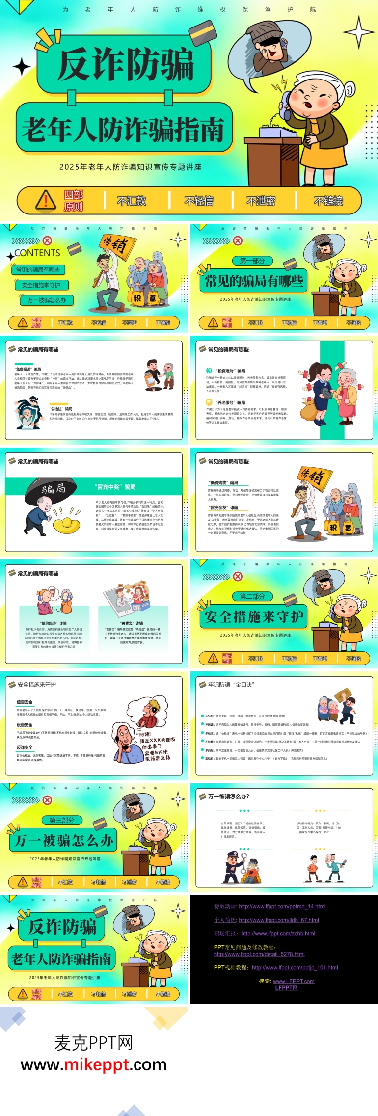 以下是一套关于老年人反诈宣传的 PPT 课件介绍,该课件共 14 页,通过精心设计的内容,旨在帮助老年人提升反诈意识和能力,同时呼吁全社会共同关注老年人的财产安全。 随着社会的发展,诈骗手段日益复杂多样,老年人群体由于信息获取渠道相对有限,往往容易成为诈骗分子的目标。为了有效提高老年人的反诈意识和能力,开展老年人反诈宣传活动显得尤为重要。通过实例分析,老年人能够在真实案例中直观地了解和认识各种诈骗手段,从而掌握防范技巧,提高识别诈骗的能力。这不仅有助于老年人自身保护财产安全,还能增强他们的自我防范意识,避免陷入诈骗陷阱。同时,反诈宣传活动也能够引起全社会对老年人群体的高度关注,营造一个关爱老年人的社会氛围。这有利于维护老年人的合法权益,让老年人在晚年生活中能够安心、放心。此外,家庭成员在这一过程中也扮演着重要角色,他们能够给予老年人更多的支持和陪伴,与老年人共同抵制诈骗行为。家庭的温暖和支持是老年人抵御诈骗的重要力量,通过家庭成员的共同努力,可以有效减少因诈骗而产生的财产损失,保障老年人的生活质量。 这份 PPT 课件由三个部分组成,内容丰富且实用。第一部分聚焦于“常见的骗局有哪些”。在这一板块中,首先介绍了“免费赠送”骗局,这种骗局通常以小恩小惠吸引老年人,然后逐步诱导他们陷入更大的陷阱。接着,课件详细分析了“公检法”骗局,诈骗分子冒充公检法人员,以各种理由要求老年人提供个人信息或转账,这种骗局利用了老年人对权威机构的信任。课件还对“投资理财”骗局进行了介绍,这种骗局以高额回报为诱饵,吸引老年人投资,实则是一场空手套白狼的诈骗行为。此外,针对老年人对养老服务的需求,课件分析了“养老服务”骗局,提醒老年人在选择养老服务时要谨慎,避免陷入诈骗陷阱。最后,课件还分析了“冒充中奖”和“冒充亲友”诈骗,这两种骗局分别利用了老年人的侥幸心理和对亲人的信任,通过虚假中奖信息或冒充亲友借钱等方式实施诈骗。 第二部分是“安全措施来守护”,这一部分为老年人提供了全面的安全建议。首先,在信息安全方面,课件强调了保护个人隐私的重要性,提醒老年人不要随意透露个人信息,如身份证号、银行卡号等。在设备安全方面,课件建议老年人定期更新手机和电脑的安全软件,以防止恶意软件的入侵。同时,还提醒老年人不要轻易点击陌生链接或下载不明来源的软件,避免设备被黑客攻击。在防诈安全方面,课件提供了一些实用的防诈技巧,如接到陌生电话或短信时要保持警惕,不要轻易相信对方的话,尤其是涉及金钱转账的情况。 第三部分是“万一被骗怎么办”,这一部分为老年人提供了应对诈骗的紧急措施。首先,课件强调了立即报警的重要性。一旦发现被骗,老年人应第一时间拨打报警电话,向警方提供尽可能详细的信息,以便警方及时采取行动。其次,课件建议老年人及时向咨询人员求助,这些咨询人员可以是社区工作人员、志愿者或专业人士,他们能够为老年人提供进一步的指导和帮助,减轻诈骗带来的损失。 通过这三部分内容的详细讲解,这套 PPT 课件为老年人提供了一个全面的反诈指南。它不仅帮助老年人识别各种常见的诈骗手段,还提供了实用的安全措施和应对策略。通过这样的宣传活动,我们希望能够提高老年人的反诈意识,减少诈骗案件的发生,同时呼吁全社会共同关注老年人的财产安全,为他们创造一个更加安全、和谐的生活环境。