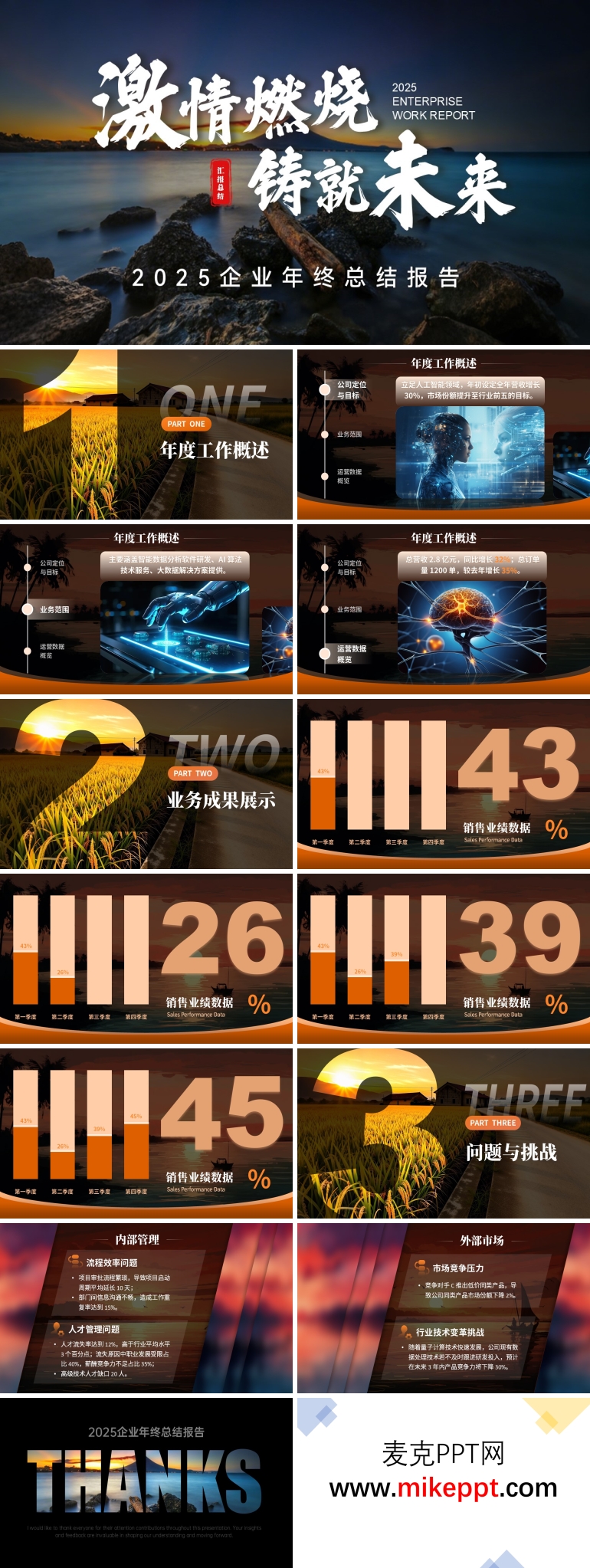 这套 PPT 是 2025 企业年终总结报告,核心围绕年度工作、业务成果、问题挑战展开。 第一部分为年度工作概述,明确公司立足人工智能与大数据领域,目标是营收增长 30%、市场份额跻身行业前五。业务涵盖智能数据分析软件研发、AI 算法技术服务等,全年总营收 2.8 亿元(同比增 32%),订单量 1200 单(同比增 35%),超额完成目标。 第二部分展示业务成果,通过数据呈现各季度销售业绩,第一至四季度占比分别为 43%、26%、39%、45%,涵盖软件业务、技术服务、解决方案三大板块。 第三部分分析问题与挑战,内部存在项目审批繁琐、部门沟通不畅,以及人才流失率高、高级技术人才缺口大的问题;外部面临竞争对手低价冲击和量子计算技术变革带来的市场竞争与技术升级压力。