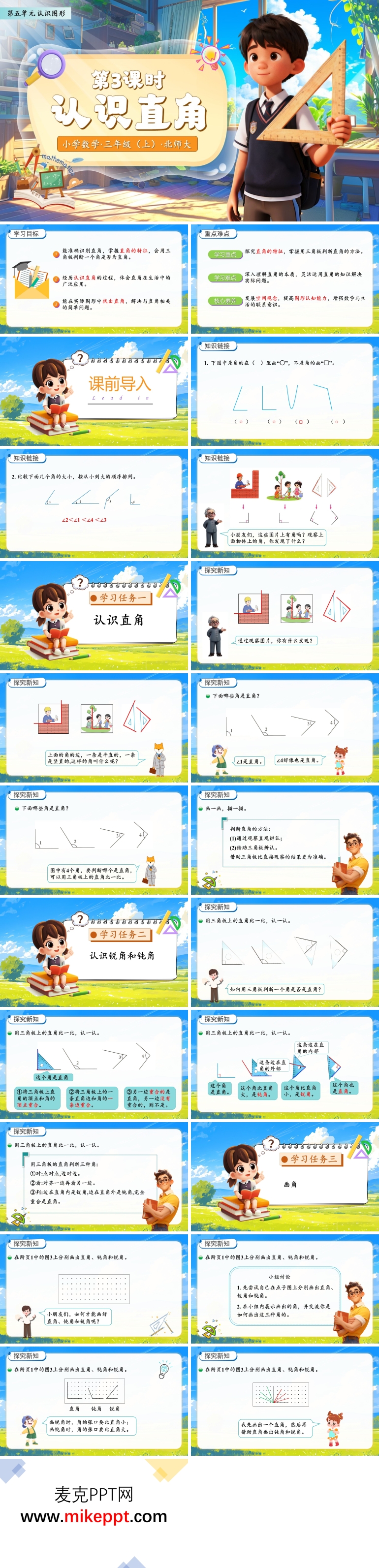 这是一套关于北师大版数学三年级上册第五单元“认识直角”的 PPT,共有 32 页。在本堂课的教学过程中,教师首先会向学生展示活动角,并提出相关问题,以此来引导学生进一步熟悉角的基本特征,为后续学习奠定基础。接着,教师会呈现教材的主题图,借助主题图引出本节课的课题,让学生初步对直角有一个直观的认识。随后,教师会引导学生开展一系列的活动,包括找直角、比直角和画直角,并且要求学生借助三角板来辨认和验证直角,通过这样的实践操作,让学生能够真正掌握直角的特征,学会运用三角板来验证直角,从而有效提升学生的动手操作能力。 这份 PPT 主要由六个部分构成。第一部分是学习目标,这部分内容首先对直角的特征进行了介绍,让学生明确直角的基本属性;然后阐述了直角在实际生活中的应用,让学生了解直角的重要性和实用性;最后展示了生活中的直角实例,让学生更加直观地感受直角的存在。第二部分是课前导入,主要是通过一些习题来呈现知识,以激发学生的学习兴趣,为新课的学习做好铺垫。第三部分是认识直角,一方面引导学生通过观察各种图片来认识直角,让学生从不同的情境中发现直角;另一方面对直角的判断方法进行了详细介绍,帮助学生掌握判断直角的技巧。第四部分是认识锐角和钝角,这部分内容主要是让学生了解除了直角之外,还有锐角和钝角这两种角,进一步丰富学生对角的认识。第五部分是画角,主要是通过小组讨论和合作的方式来进行教学,让学生在小组合作中掌握直角、锐角和钝角的特征,培养学生的团队协作能力和自主探究能力。第六部分是课堂练习,通过一系列的练习题来巩固学生对本节课知识的掌握,检验学生的学习效果,让学生能够更好地理解和运用所学知识。
