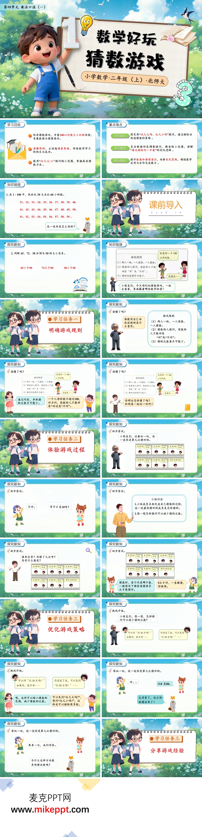 这是一套与北师大版数学二年级上册“数学好玩猜数游戏”相关的演示文稿,共包含 32 张幻灯片。本节课是一节实践活动课,旨在通过猜数游戏让学生在轻松愉快的氛围中感受数的大小关系,并引导学生探寻有序的推理方法。在教学过程中,教师要充分尊重学生的主体地位,让学生在游戏过程中不仅能够巩固数的基础知识,还能培养他们的逻辑思维能力和语言表达能力,进而增强学生学习数学的主动性和积极性。 该演示文稿由五个部分组成。第一部分是课前导入,通过展示一些有趣的课前游戏来吸引学生的注意力,激发学生的学习兴趣,为本节课的学习营造良好的氛围。第二部分是学习任务,首先明确猜数游戏的规则,让学生清楚游戏的具体要求;然后让学生亲身体验游戏过程,在实践中感受游戏的乐趣;接着引导学生进一步优化游戏策略,让学生在思考中提升自己的思维能力;最后让学生分享游戏经验,促进学生之间的交流与合作。第三部分是课堂练习,主要呈现了《猜数游戏》的练习题,通过练习让学生巩固所学知识,加深对猜数游戏的理解和掌握。第四部分是知识总结,对本节课所学的知识进行系统的梳理和总结,帮助学生构建完整的知识体系,让学生对本节课的学习内容有更清晰的认识。第五部分是课后作业,包括绘制本节课知识的思维导图和完成《分层作业》。绘制思维导图可以帮助学生更好地整合知识,培养学生的思维能力;完成《分层作业》则可以让学生根据自己的学习情况选择适合自己的作业,满足不同层次学生的学习需求,进一步巩固学生的学习成果。