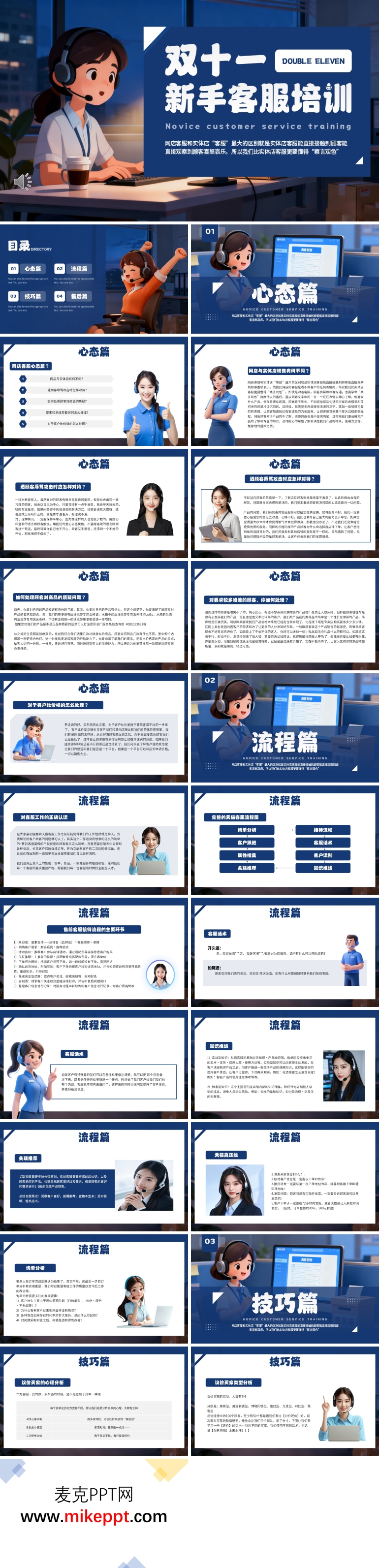 双十一新手客服培训演示文稿核心价值及内容框架 随着双十一购物狂欢节的日益临近,海量订单与咨询浪潮即将席卷而来,新手客服作为直面消费者的 “第一道防线”,其服务质量直接关乎客户体验、品牌口碑乃至企业最终的销售业绩,因此开展系统性、针对性的新手客服专项培训迫在眉睫,而本次培训所依托的 45 张幻灯片演示文稿,正是保障培训效果、夯实客服服务能力的核心载体。客服团队作为企业与消费者沟通的核心桥梁,其专业素养不仅是解答疑问、处理问题的基础,更是传递品牌理念、增强客户粘性的关键,优质的客服服务能有效降低退货率、提升复购率,成为企业在激烈双十一竞争中脱颖而出的重要支撑。 本次演示文稿围绕 “心态 - 流程 - 技巧 - 售后” 四大核心维度构建完整培训体系,形成从思想认知到实操落地的全链条赋能。第一部分 “心态篇” 作为培训开篇,首先聚焦网店与实体店销售的核心差异,从沟通场景(线上异步沟通 vs 线下即时互动)、服务边界(24 小时响应需求 vs 固定营业时间)、信任建立(依托评价体系 vs 面对面体验)等维度拆解认知,帮助新手客服快速适配线上服务场景;针对双十一期间易出现的突发状况,重点讲解顾客辱骂攻击时的情绪管理技巧,强调 “先共情再解决、不激化不对立” 的应对原则;同时提供处理商品质疑的逻辑框架,指导客服通过数据支撑、案例佐证、售后保障承诺等方式化解客户疑虑,筑牢服务心态基石。 第二部分 “流程篇” 聚焦实操规范,先明确客服核心工作内容,涵盖售前咨询应答、订单信息核对、物流进度跟进、基础问题预判等全流程职责;随后通过天猫客服流程图直观呈现订单从咨询到成交的关键节点,标注各环节易错点与注意事项;最后整理双十一高频场景标准话术库,包括活动规则解读、优惠券使用指导、商品参数说明等,确保客服应答专业统一。 第三部分 “技巧篇” 深入消费心理层面,通过典型买家画像分类(如追求性价比型、注重品质型、冲动消费型、犹豫纠结型等),解析不同类型买家的核心需求与决策逻辑,配套针对性沟通策略 —— 例如对犹豫型买家强化限时优惠提醒,对品质型买家侧重材质与工艺说明,助力客服实现 “精准沟通”。 第四部分 “售后篇” 则聚焦服务闭环,针对双十一期间高发的退换货、物流延误、商品破损等售后问题,明确处理流程、权责边界与解决方案,强调 “快速响应、主动担责、高效补救” 的服务原则,通过规范售后处理提升客户满意度,最大限度降低负面评价影响。