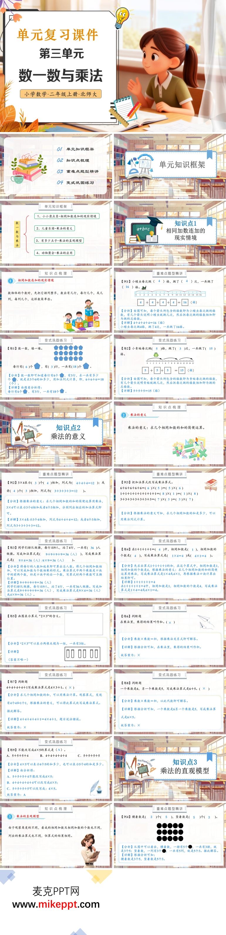 这是一套北师大版数学二年级上册第三单元“数一数与乘法”的单元复习 PPT 课件,共包含 33 张幻灯片。本节课旨在帮助学生系统地回顾乘法的意义,明确乘法与加法之间的紧密联系,熟练掌握乘法算式的读写方法以及各个部分的名称。同时,通过本节课的学习,让学生深刻感受到乘法在日常生活中的广泛应用,从而培养他们主动运用数学知识解决实际问题的意识和能力。 该套 PPT 从以下四个部分展开本节课程的学习: 第一部分:单元知识框架 在这一部分,重点帮助学生梳理本单元的知识点,构建起清晰的知识框架。具体包括四个核心知识点:一是相同加数连加的现实情境,让学生在实际生活中理解乘法产生的背景;二是乘法的意义,让学生明白乘法是求几个相同加数和的简便运算;三是乘法的直观模型,通过直观的图形和操作帮助学生理解乘法的含义;四是乘法的应用,引导学生将乘法知识运用到解决实际问题中,感受乘法的实用性。 第二部分:知识点梳理 这一部分对本单元的知识点进行详细梳理,确保学生对每个知识点有清晰的认识和理解。通过回顾和总结,帮助学生巩固所学知识,为后续的学习打下坚实的基础。 第三部分:重难点题型精讲 在这一部分,主要通过分析典型例题,帮助学生深入理解不同题型的解题方法和思路。通过对重点和难点题型的讲解,提高学生解决实际问题的能力,使学生能够更加灵活地运用所学知识。 第四部分:变式巩固练习 这一部分通过设计多样化的练习题,帮助学生加强对知识点的理解和应用。通过变式练习,进一步巩固学生对乘法知识的掌握,提高学生的思维能力和解题技巧,使学生能够熟练运用乘法解决各种实际问题。 整体而言,这套 PPT 课件内容丰富,结构清晰,通过系统的复习和针对性的练习,旨在帮助学生全面掌握乘法知识,提升数学素养和实际应用能力。