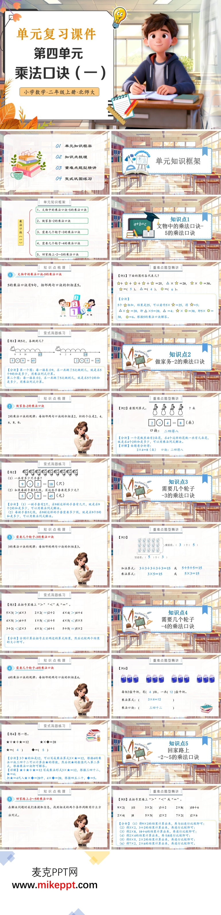 本套 PPT 课件针对北师大版数学二年级上册第四单元 “乘法口诀(一)” 的单元复习打造,共 29 张幻灯片。课程设计围绕双重目标展开:一方面助力学生系统梳理 2~5 的乘法口诀,实现从 “记住” 到 “熟练记忆”、从 “会用” 到 “准确运用” 的进阶,能依托口诀快速计算对应乘法算式;另一方面让学生完整经历 “口诀梳理 — 规律探究 — 分层练习 — 生活应用” 的学习流程,在过程中提升口诀记忆的高效性与乘法知识的实际应用能力,让复习既夯实基础,又培养能力。 为达成目标,PPT 以四大板块有序推进教学。第一部分是 “单元知识框架”,通过结构化呈现,将本单元与 2~5 乘法口诀相关的知识点串联整合,帮助学生跳出单个口诀的孤立记忆,建立起清晰的知识体系,为后续复习筑牢基础。 第二部分为 “知识点梳理”,聚焦 2~5 的乘法口诀核心内容。通过具体案例拆解每句口诀的来源与含义,让学生不仅能背诵,更能理解口诀的推导逻辑,比如从 “3 个 2 相加得 6” 理解 “二三得六”,确保对知识点的掌握扎实深入。 第三部分是 “重难点题型精讲”,针对学生易混淆、难应用的问题精选例题。通过分析口诀记忆混淆、实际问题应用等典型题目,详细讲解解题思路与方法,比如教学生从应用题中提取 “每份数” 和 “份数”,再匹配对应口诀计算,助力学生突破难点,提升解题能力。 第四部分为 “变式巩固练习”,设计多样练习题。涵盖填空、选择、判断、计算及应用题等类型,且通过变换情境、调整数据、转换提问方式,让学生在不同场景中灵活运用口诀,既避免练习枯燥,又能全面检验学习效果,及时弥补知识漏洞,保障复习实效。