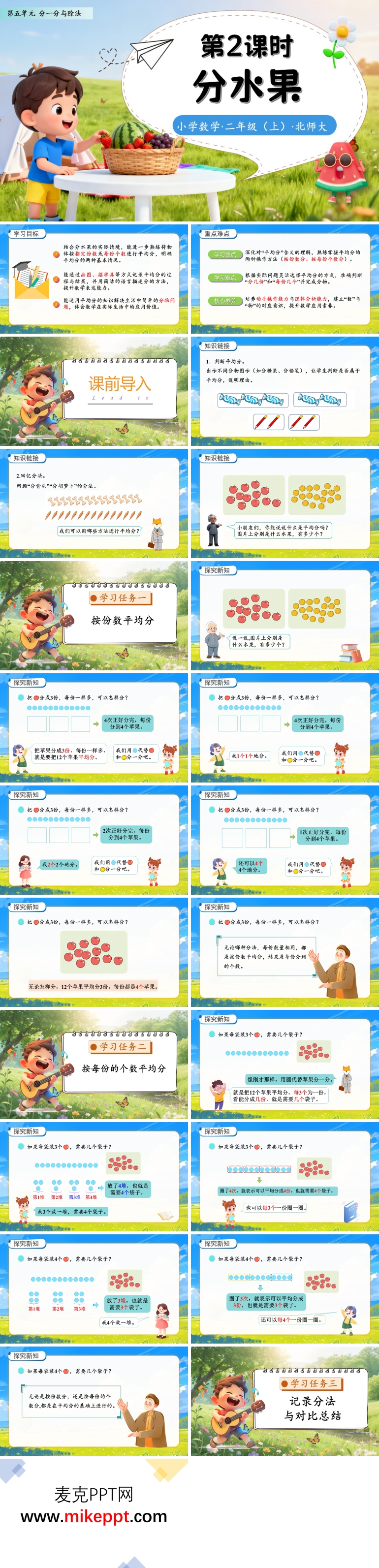 本套 PPT 课件专为北师大版数学二年级上册第一单元 “100 以内加与减(二)” 的单元复习设计,共 38 张幻灯片。课程围绕双重核心目标展开:一方面帮助学生系统梳理 100 以内两位数加、减两位数(含进退位)的计算方法,重点攻克竖式计算的书写规范(如相同数位对齐、从个位算起)与进退位规则(加法个位满 10 向十位进 1、减法个位不够减从十位退 1 当 10),实现计算从 “会算” 到 “熟练算、准确算” 的提升;另一方面引导学生经历 “自主整理知识 — 小组合作交流 — 动手实操计算” 的过程,在实践中培养严谨的计算习惯,同时提升计算能力与解决实际问题的能力,让复习课兼具知识巩固与素养培养的价值。 为达成上述目标,整套 PPT 以逻辑清晰的四大板块推进教学。第一部分是 “单元知识框架”,通过结构化图表将本单元知识点(两位数加两位数、两位数减两位数的口算与竖式计算,进退位规则,实际问题解决等)串联整合,帮助学生跳出零散知识的记忆,建立完整的单元知识体系,为后续深入复习奠定基础。 第二部分为 “知识点梳理”,聚焦核心计算内容的细化讲解。针对两位数加、减两位数的竖式计算,结合具体例子拆解每一步流程,如计算 “35+28” 时,强调 “相同数位对齐,个位 5+8=13 满 10 向十位进 1,十位 3+2+1=6”,让学生不仅掌握方法,更理解背后的算理。 第三部分是 “重难点题型精讲”,针对学生易出错的进退位计算、实际问题列式等难点,精选典型例题。通过分析 “42-17” 这类退位减法的易错点,以及 “购物时计算总价或找零” 的实际问题,讲解解题思路与避错技巧,帮助学生突破难点,提升解题能力。 第四部分为 “变式巩固练习”,设计多样化练习题,涵盖竖式计算、口算、判断题、实际应用题等类型。通过变换数据、调整问题情境(如从 “计算书本数量” 变为 “计算班级人数”),让学生在不同场景中灵活运用计算方法,既避免练习枯燥,又能全面检验学习效果,及时弥补知识漏洞,保障复习实效。