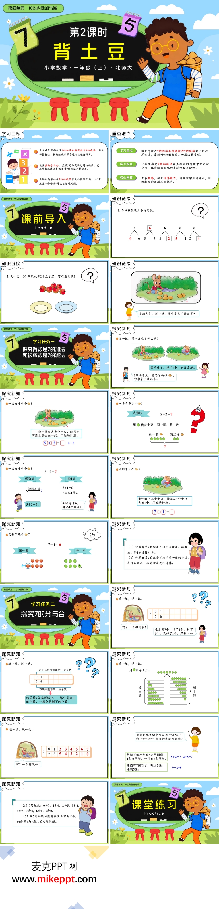 这是一套北师大版一年级数学上册“背土豆”主题的PPT课件模板,共包含28张幻灯片。该课件以“背土豆”这一生动的生活情境为核心,旨在通过贴近学生生活的场景,引导他们深入理解加法和减法的运算规则。通过绘画、模拟背土豆的实践活动以及结合生活实际经验,学生能够更好地解决相关的数学应用题,从而提升他们的数学思维和实践能力。 整个PPT模板内容丰富且结构清晰,主要通过PowerPoint软件分为六个部分进行详细讲解。第一部分是课程的开篇,明确列出了本节课的学习目标以及教学的重点和难点,为学生的学习提供了清晰的方向和重点。第二部分是知识链接环节,通过复习旧知识,帮助学生建立新旧知识之间的联系,为新知识的学习做好铺垫。 第三部分是学习任务的布置,通过具体的任务设置,引导学生主动思考和探索,培养他们的自主学习能力。第四部分是探究环节,通过具体的案例分析,深入探讨数字7的分与合,帮助学生理解数字的组成和分解,这是学习加减法的基础。通过这一环节,学生能够更好地掌握加减法的运算规则。 第五部分是课堂练习环节,通过多样化的练习题,巩固学生对加减法的理解和应用能力。练习题的设计注重与生活实际相结合,让学生在解决实际问题的过程中加深对数学知识的理解。最后一部分是课堂总结,通过回顾本节课的重点内容,帮助学生梳理知识体系,强化记忆,为后续的学习打下坚实的基础。 这套PPT模板设计科学合理,内容生动有趣,能够充分调动学生的学习积极性,使他们在轻松愉快的氛围中掌握十以内加减法的运算规则。它不仅适用于课堂教学,还可以作为教师教学设计和学生自主学习的有力工具。