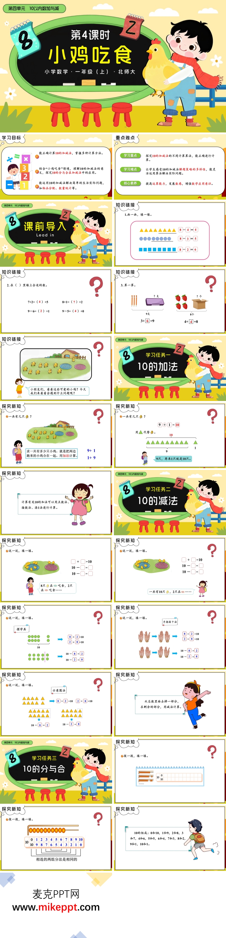 这是一套北师大版小学数学一年级第四单元第四课时“小鸡吃食”主题的PPT课件模板,共包含30张幻灯片。本节课通过“小鸡吃食”这一生动有趣的生活情境,引导学生熟练掌握数字九的加减法计算及其运算法则。这种情境化的教学设计旨在激发学生的学习兴趣,让他们在轻松愉快的氛围中感受数学的趣味性,同时提升他们的数学计算能力。 整个PPT模板通过PowerPoint软件分为五个部分展开。第一部分是学习目标的介绍,明确指出本节课学生需要掌握的核心内容。通过设定清晰的学习目标,学生能够明确本节课的学习方向,了解自己需要达成的技能和知识水平。例如,学生不仅要掌握数字九的加减法,还要学会多种计算方法,从而培养他们的数学思维和灵活运用知识的能力。 第二部分是课前导入环节,通过“画一画,填一填”的习题形式,引导学生回顾旧知识,为新知识的学习做好铺垫。这种导入方式不仅能够帮助学生快速进入学习状态,还能通过动手操作激发他们的学习兴趣。通过简单的绘画和填空活动,学生能够在实践中初步感受加减法的运算规则,为后续的深入学习奠定基础。 第三部分是课堂习题环节,通过多样化的练习题,帮助学生巩固所学知识。这些习题设计注重与生活实际相结合,让学生在解决实际问题的过程中加深对数学知识的理解。通过反复练习,学生能够熟练掌握九的加减法运算,提升计算速度和准确性。 第四部分是探究新知环节,详细讲解了九的加减法的运算法则。通过生动的小鸡吃食情境,将抽象的数学知识转化为具体的生活场景,帮助学生更好地理解加减法的含义。例如,通过小鸡吃食的数量变化,学生可以直观地看到加法和减法的实际应用,从而加深对运算法则的理解和记忆。 最后一部分是运算法则的背诵环节,通过总结和回顾,帮助学生系统梳理本节课所学的运算法则。通过背诵和记忆,学生能够将这些法则内化为自己的知识体系,为后续更复杂的数学学习打下坚实的基础。 这套PPT模板设计科学合理,内容丰富且富有教育意义。通过情境化教学和多样化的练习,学生不仅能够掌握九的加减法运算,还能在学习过程中培养数学思维和解决实际问题的能力。这种教学方式不仅提高了学生的学习兴趣,还为教师提供了高效的教学工具,能够有效提升课堂教学效果。