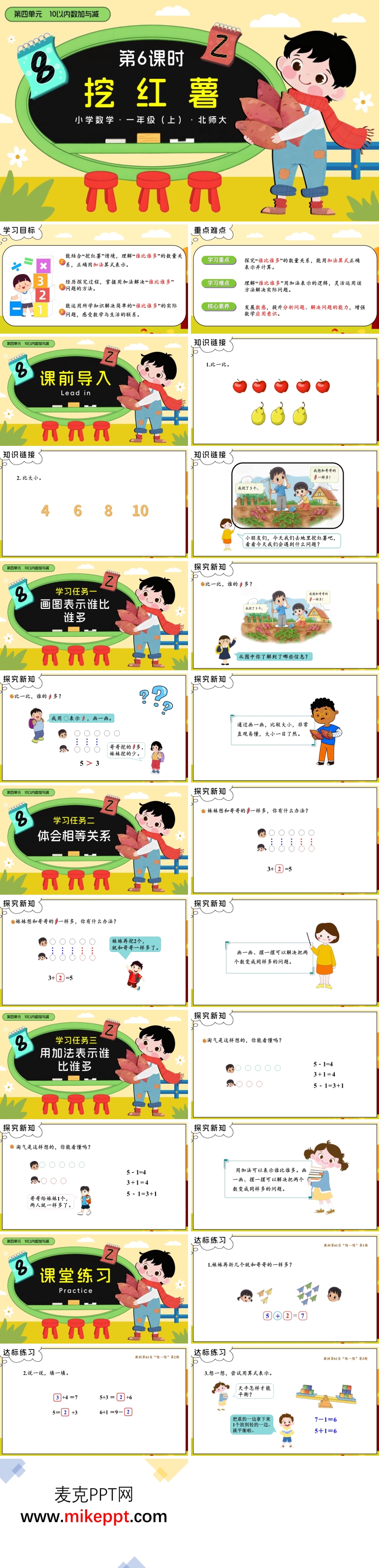 这是一套北师大版一年级数学上册第四单元第六课时“挖红薯”的学习与培训PPT课件模板,共包含25张幻灯片。在上一堂课中,我们通过“乘车”这一生活场景引导学生学习数学知识。而在本节课中,我们将引入一个新的生活场景——“挖红薯”,通过这一生动的情境展开对“谁比谁多”数量关系的学习。这一设计旨在帮助学生将数学知识与实际生活紧密结合,从而更好地解决生活中遇到的数学问题。 整个PPT模板通过PowerPoint软件分为四个部分展开。第一部分是学习目标的介绍。本节课的学习目标是让学生理解并掌握“谁比谁多”的数量关系,并能够运用所学知识解决实际问题。通过明确的学习目标,学生能够清晰地了解本节课的重点内容,从而更有针对性地参与课堂学习。 第二部分是课前导入环节。通过展示苹果和梨子的数量对比,引导学生对“谁比谁多”的概念形成初步认识。这种导入方式不仅能够吸引学生的注意力,还能帮助他们快速进入学习状态。例如,通过展示一组苹果和一组梨子,让学生直观地比较两组数量的差异,从而引出“谁比谁多”的问题。这种直观的对比能够帮助学生更好地理解数量关系,为后续的学习奠定基础。 第三部分是学习任务的布置,主要围绕“画图演示谁比谁多”展开。通过具体的画图任务,引导学生将抽象的数量关系转化为直观的图形表示。例如,让学生用小圆圈或小方块分别表示苹果和梨子的数量,通过一一对应的方式直观地展示“谁比谁多”。这种画图演示不仅能够帮助学生更好地理解数量关系,还能培养他们的动手能力和逻辑思维能力。通过动手操作,学生能够更深刻地感受到数量之间的差异,从而加深对“谁比谁多”概念的理解。 第四部分是关于体会相等关系的学习内容。在理解了“谁比谁多”之后,进一步引导学生体会数量之间的相等关系。通过对比“谁比谁多”和“谁和谁一样多”的情境,帮助学生全面理解数量关系。例如,通过展示两组数量相同的物品,让学生认识到“一样多”的概念,并通过对比“多”和“一样多”的情境,进一步巩固对数量关系的理解。这种对比学习方式能够帮助学生更好地掌握数量关系的多样性,提升他们的数学思维能力。 这套PPT模板设计科学合理,内容丰富且富有教育意义。通过“挖红薯”这一生动的生活场景,将数学知识与实际生活紧密结合,不仅能够激发学生的学习兴趣,还能帮助他们在解决实际问题的过程中提升数学思维和应用能力。这种教学方式不仅提高了学生的学习积极性,还为教师提供了高效的教学工具,能够有效提升课堂教学效果。通过本节课的学习,学生将更加深刻地认识到数学在生活中的重要性,为他们今后的数学学习奠定坚实的基础。