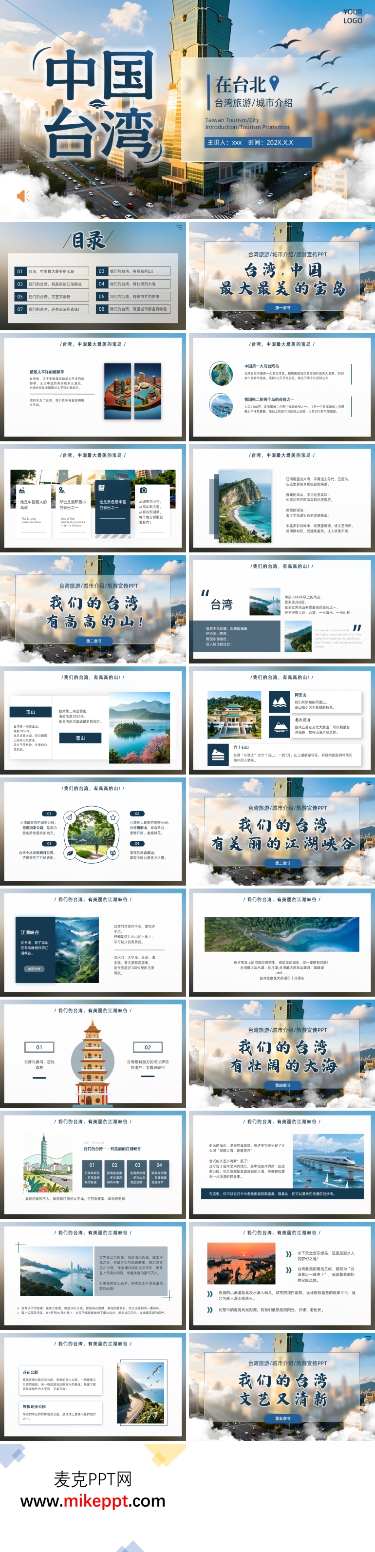 PPT模板内容主要通过PowerPoint软件分几个部分来向我们展开介绍有关于中国台湾城市介绍和宣传课件的相关内容。PPT模板内容第一部分主要是有关于台湾中国最美宝岛的相关内容。第二部分是关于台湾高山的相关内容。第三部分是台湾江湖峡谷的相关内容。第四部分是台湾的大海景区介绍。第五部分是”我们的台湾,文艺又清新”的相关内容。第六部分是台湾的夜市介绍。第七部分是台湾古味的具体内容。最后一部分是台湾各城市的特色文化。