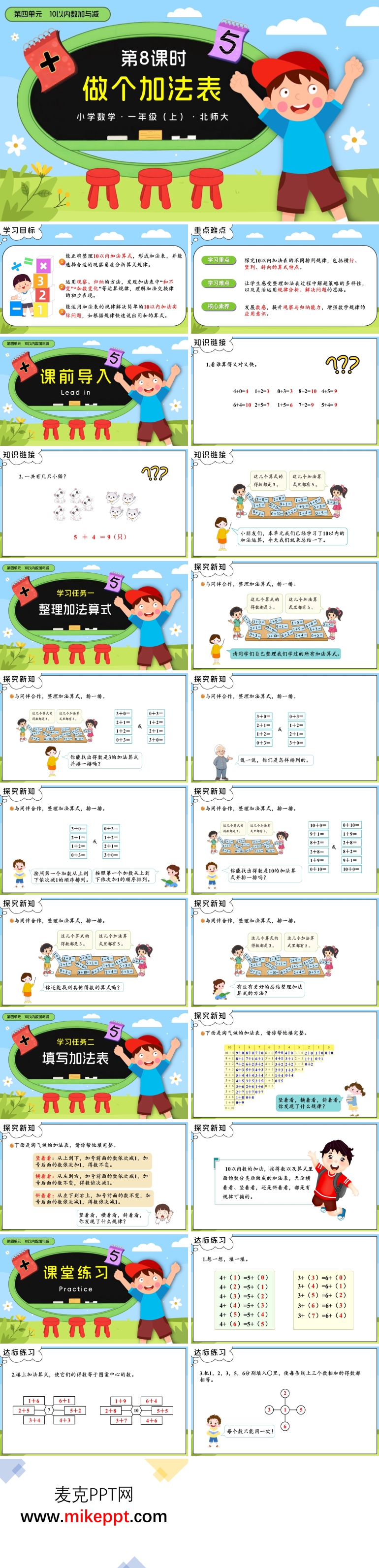 这是一套北师大版一年级数学上册第四单元第八课时“做个加法表”的学习与培训PPT课件模板,共包含25张幻灯片。在前面的课程中,我们已经引导学生掌握了基本的加法和减法运算法则,能够进行简单的计算。而本节课的重点是帮助学生系统地整理十以内的加法算式,并通过制定加法表,让学生能够更直观地了解加法算式的排列规律。这种系统化的学习方式不仅有助于学生巩固加法知识,还能培养他们的逻辑思维和归纳总结能力。 整个PPT模板通过PowerPoint软件分为六个部分展开。第一部分是学习目标的明确阐述。本节课的学习目标是让学生能够系统地整理十以内的加法算式,并通过制作加法表,掌握加法算式的排列规律。通过设定清晰的目标,学生能够清楚地了解本节课的重点内容,从而更有针对性地参与课堂活动。 第二部分是教学重点和难点的突出。这部分内容详细说明了本节课的核心知识点,如如何系统地整理加法算式,以及如何通过加法表发现规律。同时,也指出了学生在学习过程中可能遇到的挑战,例如如何准确地归纳加法算式的规律。通过明确重点和难点,教师可以更有针对性地进行教学,学生也能更好地理解学习内容。 第三部分是课前导入和知识链接环节。通过复习前面课程中学习的加法和减法知识,引导学生回顾已掌握的运算法则,为本节课的学习做好铺垫。同时,通过引入一些与加法表相关的知识,帮助学生建立起新旧知识之间的联系,使他们能够更好地理解加法表的意义和作用。 第四部分是关于整理加法算式的学习要求。这部分内容详细说明了学生在整理加法算式时需要遵循的步骤和方法。例如,如何按照一定的顺序列出所有十以内的加法算式,以及如何分类整理这些算式。通过这些具体的学习要求,学生能够更有条理地进行加法算式的整理工作,为制作加法表打下坚实的基础。 第五部分是探究新知环节。通过具体的教学活动,引导学生发现加法算式的排列规律。例如,通过观察加法表中的数字,学生可以发现加数与和之间的关系,以及不同加法算式之间的联系。通过这种探究式学习,学生不仅能够掌握加法表的制作方法,还能培养他们的观察力和逻辑思维能力。 第六部分是让学生填写加法表。这部分内容通过具体的实践操作,让学生将所学的加法算式整理并填入加法表中。通过动手填写加法表,学生能够更直观地看到加法算式的排列规律,进一步巩固所学知识。同时,这种实践操作也有助于学生加深对加法表的理解和记忆。 这套PPT模板设计科学合理,内容丰富且富有教育意义。通过系统化的教学设计和多样化的教学环节,学生不仅能够掌握十以内加法算式的整理方法,还能通过制作加法表,提升他们的逻辑思维和归纳总结能力。这种教学方式不仅提高了学生的学习兴趣,还为教师提供了高效的教学工具,能够有效提升课堂教学效果。通过本节课的学习,学生将更加深刻地理解加法的规律,为他们今后的数学学习奠定坚实的基础。