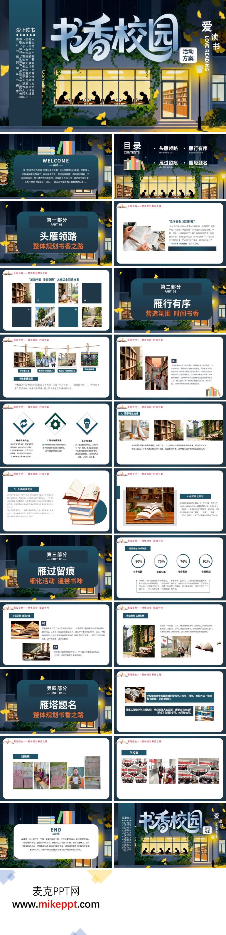 这是一份精心设计的"爱上读书·书香校园"主题活动策划PPT模板,采用PowerPoint专业制作,共涵盖23页精美幻灯片,系统呈现了构建书香校园的完整实施方案。 中华文脉绵延数千年,诗书传家的传统早已深深镌刻在民族精神之中。在快节奏的现代生活里,阅读不仅是充实闲暇时光的诗意方式,更是沉淀内心、丰盈学识的精神滋养。当我们沉浸书海,知识便如涓涓细流汇入心田,让我们的谈吐更见风雅,思想更趋深沉。正是基于这样的文化自觉,本方案以四大篇章铺展开一幅书香浸润校园的美好蓝图。 首章聚焦于顶层设计与组织保障。学校将专门成立"书香校园"阅读指导小组,作为统筹全局的核心机构,负责策划、引导并推进全校师生系列读书活动的有序开展,为活动提供坚实的组织支撑。 次章着力于环境营造与氛围熏陶。通过加大投入力度,倾力打造处处可读、时时能读的立体化阅读空间——从精心布置的图书角到书香氤氲的文化长廊,从晨诵午读的悠然时光到班级图书漂流站的便捷共享,力求让校园的每个角落都弥漫着淡雅的书卷气息,让阅读成为师生最自然的生活方式。 第三章重在活动创新与激励机制。学校将定期举办读书沙龙、经典诵读、主题征文、阅读之星评选等丰富多彩的评比活动,以赛促读,以奖激趣。通过这些具体可感的载体,激发班级之间的良性竞争,让书香氛围在比学赶超中愈发浓厚,让师生读书的自觉性与主动性持续高涨,真正尝到阅读的甘甜滋味。 末章关注家校协同与共育格局。方案特别强调要打破校园围墙,将书香气息延伸至每一个家庭。通过亲子共读、家庭书房展示、家长读书分享会等形式,构建学校与家庭双向联动的读书共同体,让阅读成为连接家校的情感纽带,让学习型的书香氛围在更广阔的空间里生根发芽。 整套方案思路清晰、举措务实,旨在让师生在书页翻飞中遇见更好的自己,让校园在书香浸润中焕发文化的光彩。