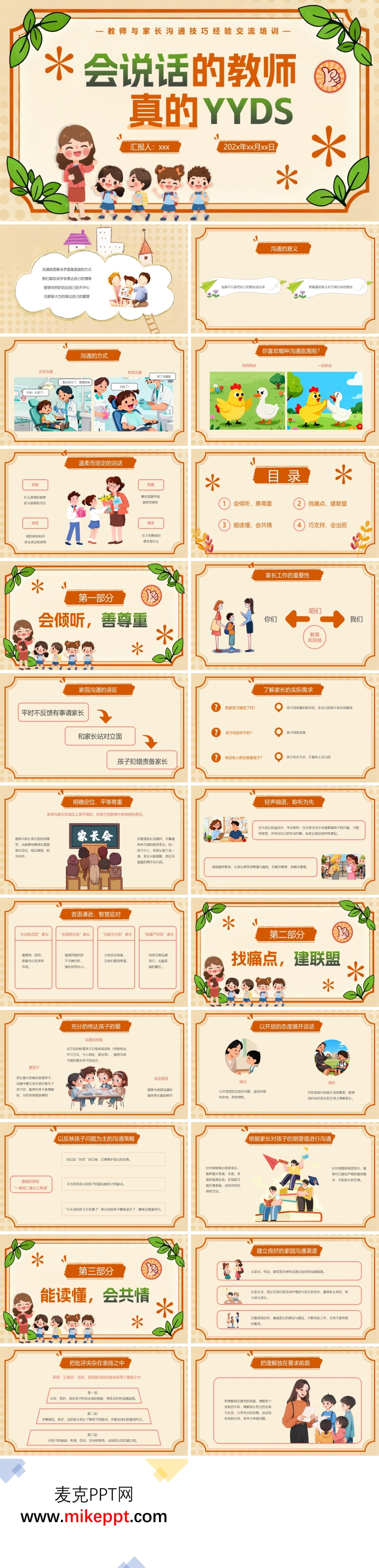 PPT模板内容主要通过PowerPoint软件分四个部分进行讲解教师如何高效的与学生家长沟通。首先第一个部分尤其重要,老师需要学会倾听家长的内心和诉求善于尊重家长。第二个方面快速找到家庭的痛点,与家长站在同一起跑线,组成一个联盟共同体。第三个方面能够快速读懂家长的情绪有共情能力。第四个部分巧支持,懂得如何出招事倍功半解决核心问题。
