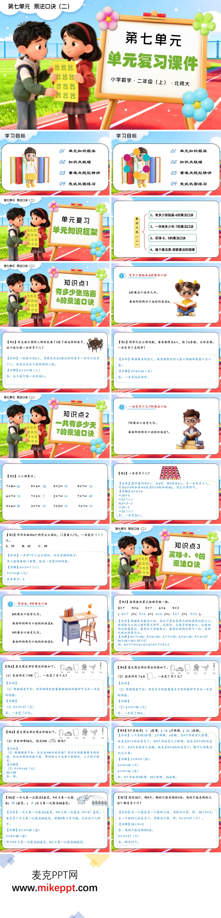 这是一套专为北师大版数学二年级上册第七单元“乘法口诀”设计的单元复习课件PPT模板,通过PowerPoint软件精心制作,共包含29张幻灯片。复习课是教学过程中不可或缺的重要环节,它不仅是教师检测教学成果的有效方式,更是学生发现自身不足并及时弥补的关键时刻。因此,复习课对于每个单元来说都具有至关重要的作用。而这份演示文稿正是围绕第七单元“乘法口诀”的复习展开,通过四个部分系统地帮助学生巩固和深化对乘法口诀的理解与应用。 演示文稿的第一部分是“单元知识框架介绍”。在这一部分,通过思维导图的形式,清晰地呈现了本单元的核心内容,包括六的乘法口诀、七的乘法口诀、八和九的乘法口诀,以及引导学生探究乘法口诀的规律。这种结构化的呈现方式,帮助学生从整体上把握单元知识体系,理清知识脉络,为后续的复习奠定基础。 第二部分是“知识点梳理”。这一部分详细总结了每一个数的乘法口诀规律,帮助学生系统回顾和梳理所学知识。通过对乘法口诀的规律进行总结,学生能够更加清晰地理解乘法口诀的内在联系,从而更好地记忆和运用口诀。例如,通过分析口诀中的数字规律,学生可以发现“一六得六,二六十二”等口诀中数字的递增规律,从而更加高效地掌握乘法口诀。 第三部分是“重难点题型精讲”。在这一部分,通过精选的例题,引导学生逐步攻克学习过程中的重难点。教师通过详细的讲解和示范,帮助学生理解乘法口诀在实际问题中的应用,尤其是那些容易混淆或出错的题型。通过例题的讲解,学生不仅能够巩固所学的乘法口诀,还能学会如何灵活运用口诀解决实际问题,提高解题能力。 第四部分是“变式巩固练习”。这一部分提供了多样化的练习题,通过变式训练,帮助学生进一步巩固所学知识。变式练习通过改变题目的形式和难度,让学生在不同的情境中运用乘法口诀,从而加深对知识的理解和掌握。这种练习方式不仅能帮助学生熟练掌握乘法口诀,还能培养他们的思维灵活性和应变能力。 整套PPT模板设计科学合理,内容丰富实用。通过思维导图梳理知识框架、总结规律、精讲例题以及变式练习等多种方式,全面覆盖了第七单元“乘法口诀”的复习要点。这种系统化的复习方式不仅帮助学生巩固知识,还能提高他们的学习兴趣和自信心,为后续的数学学习打下坚实的基础。