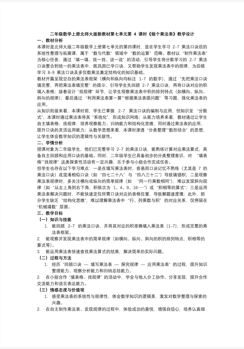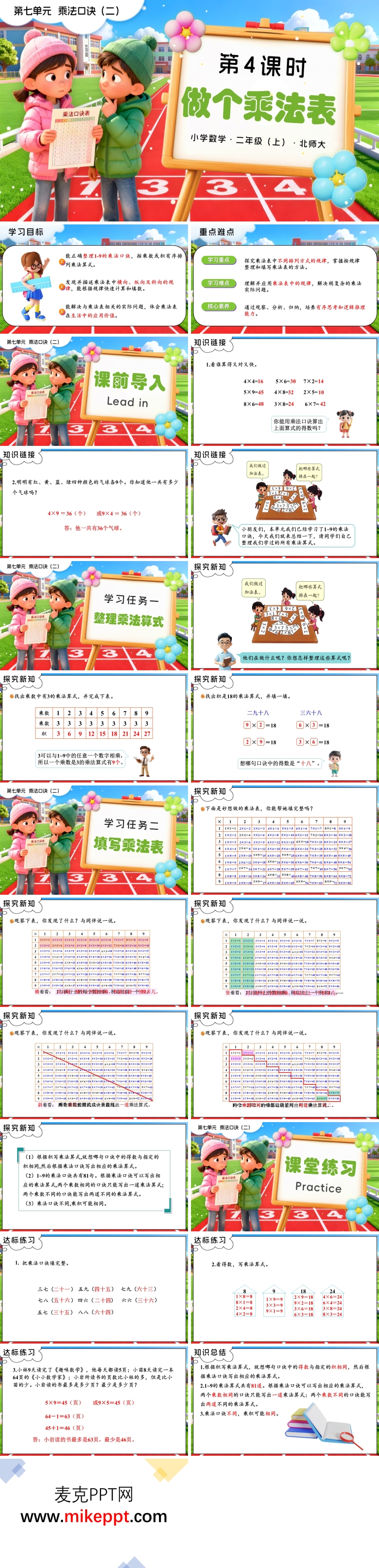 这是一套专为北师大版二年级数学上册第七单元第四课时“做个乘法表”设计的PPT模板,通过PowerPoint软件精心制作,共包含24张幻灯片。在学生学习完1~9的乘法口诀后,本节课旨在引导学生自主制作乘法口诀表,以此检测他们对乘法口诀的掌握情况,并帮助学生发现乘法口诀表中隐藏的规律,如横向、纵向及斜向的规律。通过这些规律的学习,学生能够更好地运用乘法口诀解决生活中的实际问题,进一步提升他们的数学思维能力和应用能力。 演示文稿从五个部分展开,内容丰富且结构清晰。第一部分是“情景导入”。在这一环节中,教师通过复习之前学过的乘法口诀,帮助学生回顾和巩固已有的知识,为本节课的学习做好铺垫。这种导入方式能够激活学生的思维,激发他们的学习兴趣,使他们更快地进入学习状态。 第二部分是“整理乘法算式”。这一部分通过具体的练习,引导学生找出指定的乘法算式,并完成相关练习。通过这一环节,学生能够进一步熟悉乘法口诀,并在实际操作中加深对乘法算式的理解。同时,教师还可以通过学生的练习情况,及时发现他们在学习过程中存在的问题,并进行针对性的指导。 第三部分是“填写乘法口诀表”。在这一环节中,教师引导学生自主完成乘法口诀表的填写。通过填写过程,学生不仅能够巩固对乘法口诀的记忆,还能在完成表格后总结其中的规律。例如,学生可以发现横向的规律(每一行的积逐渐增大)、纵向的规律(每一列的积也逐渐增大)以及斜向的规律(如对角线上的积具有特殊关系)。通过这些规律的发现,学生能够更加系统地理解和掌握乘法口诀,从而提高他们的数学思维能力。 第四部分是“达标练习、知识总结和课后作业”。这一部分通过多样化的练习题,帮助学生巩固本节课所学的知识和技能。练习题的设计注重层次性和趣味性,既能满足不同学生的学习需求,又能激发他们的学习积极性。教师还会对本节课的知识进行总结,梳理重点内容,帮助学生更好地掌握知识。最后,课后作业部分为学生提供了进一步巩固和拓展学习的机会,鼓励他们在生活中寻找乘法的应用实例,将所学知识应用到实际生活中。 整套PPT模板设计科学合理,内容丰富多样。通过情景导入、整理算式、填写口诀表、练习巩固以及知识总结五个环节,系统地引导学生学习“做个乘法表”的内容。这种结构化的教学设计不仅帮助学生更好地掌握乘法口诀,还能培养他们的数学思维和应用能力。通过生动的展示和丰富的互动,学生能够在轻松愉快的氛围中学习数学,提高学习效果,为后续的数学学习打下坚实的基础。