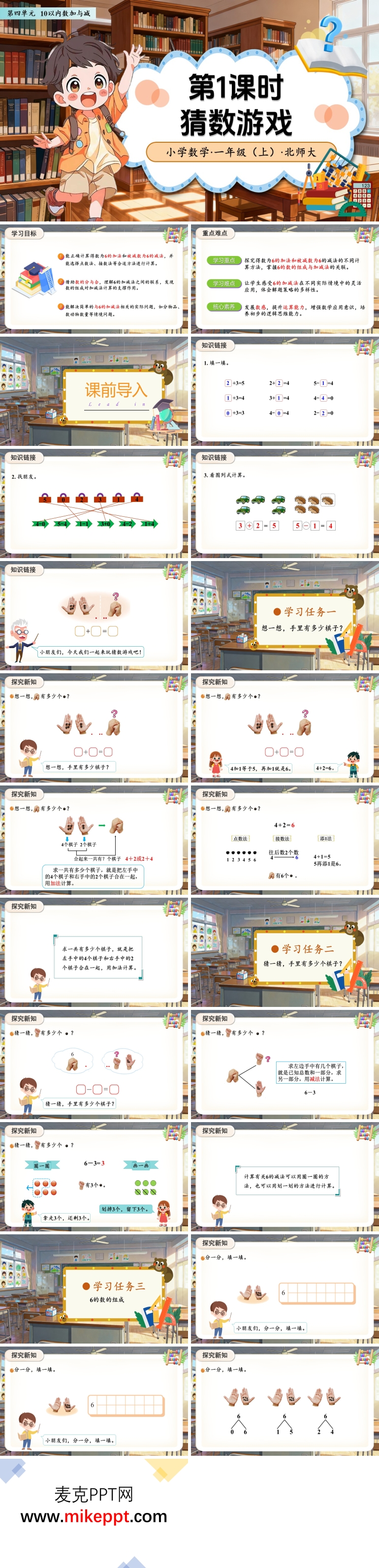 这套北师大版一年级数学上册《猜数游戏》第四单元第1课时的PPT课件模板,共35张幻灯片,以“猜一猜、想一想、算一算”为主线,把枯燥的计算包装成一场充满悬念的数字探险。课堂从“魔法盒子”里蹦出6颗星星开始:老师偷偷藏起几颗,学生通过观察剩下的数量,反向猜“藏起了几颗”,在“猜对啦”的欢呼声中,6的分解与组成被孩子自己“悟”出来;接着进入“数字小侦探”环节,课件依次呈现“左手有2颗,右手有几颗?”“原来有6颗,飞走3颗,还剩几颗?”等生活化情境,学生边摆小圆片边记录算式,教师顺势板书“6-2=4、6-3=3……”并圈出加减互逆关系,让“总数-部分=另一部分”的模型在脑海里生根;第三板块“小组对抗赛”把课堂推向高潮——四人小队轮流抽“谜语卡”,如“我加上4就是6,我是谁?”“6比我多1,我是几?”孩子们抢答、板演、互相评价,既练口算又练思维;最后5分钟“闪卡游戏”巩固混合运算:屏幕随机跳出“3+□=6”“6-□=2”等填空,学生举数字牌作答,速度最快的小组赢得“数字小达人”徽章。整套模板画面清新、节奏明快,将“6的加减法”与“简单混合运算”巧妙融于猜数、摆学具、说算理、抢答的层层活动中,让一年级小朋友在笑声里建立数感、符号意识与初步的代数思维,真正做到“玩中学、学得快、记得牢”。