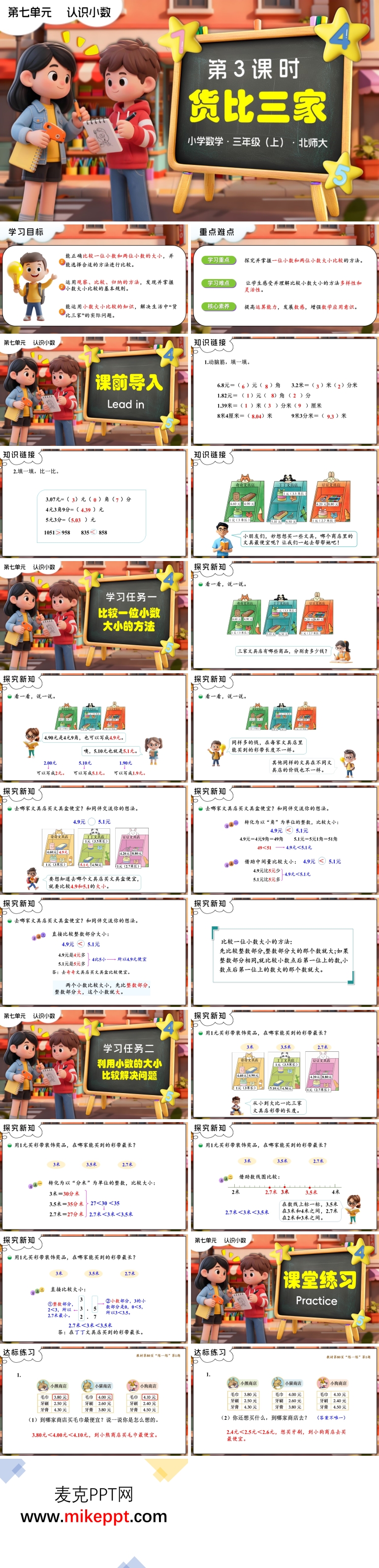 《北师大新教材数学三年级上册第七单元第3课时“货比三家”》PPT课件是一套专为三年级学生设计的数学教学资源,旨在通过贴近生活的“货比三家”情境,帮助学生进一步理解以“元”为单位的小数的实际意义,并掌握小数大小比较的方法。课件共包含27张幻灯片,内容丰富且结构清晰,通过两个主要部分展开本节课的学习。同时,通过模拟购物、价格对比、小组讨论等活动,引导学生经历“收集价格信息—比较价格—做出选择”的过程,体验小数在生活中的实用价值。 课程设计与目标 本节课以“货比三家”为主题,通过生活化的购物场景引导学生进一步理解小数的意义,并掌握小数大小比较的方法。课程不仅注重学生对小数基本概念的理解,还通过实际购物活动,帮助学生明确小数各部分对应“元、角、分”的关系。通过本节课的学习,学生能够更好地理解小数在实际生活中的应用,提升解决实际问题的能力。 课程内容与结构 第一部分:比较一位小数大小的方法 这一部分通过创设“货比三家”的生活情境,展示不同商店中商品的价格标签,引导学生观察并发现小数在表示价格时的实际意义。例如,通过比较“2.5元”和“2.8元”,学生可以直观地理解小数点后第一位(十分位)表示“角”,从而掌握比较一位小数大小的方法。 课件通过详细的步骤解析,帮助学生总结出比较一位小数大小的规则:先比较整数部分,整数部分大的数更大;如果整数部分相同,则比较小数部分。通过这种逐步引导的方式,学生能够更清晰地理解小数大小比较的方法。 此外,课件还通过互动环节,如模拟购物活动,让学生在实际操作中练习比较小数的大小。例如,学生可以选择不同商店的商品,通过比较价格来决定购买哪家的商品。这种实践性教学方式不仅激发了学生的学习兴趣,还培养了他们的实际应用能力。 第二部分:利用小数的大小比较解决问题 在掌握了比较小数大小的方法后,课件进一步引导学生将这一方法应用于实际问题的解决中。这一部分通过解决实际问题,如“哪家商店的商品更便宜”“哪种商品更划算”,引导学生用不同的方法来比较大小。 例如,课件展示了一个小组讨论的场景,学生们通过讨论发现,除了直接比较价格外,还可以通过计算单位价格(如每千克的价格)来比较商品的性价比。通过这种多样化的解题方法,学生能够更灵活地运用小数大小比较的知识,提升解决实际问题的能力。 此外,课件还通过丰富的练习题,帮助学生巩固这一知识点。例如,通过练习题“比较两家商店的同一种商品价格,哪家更便宜?”“计算不同商品的单位价格,选择性价比最高的商品”,学生能够逐步掌握将小数大小比较应用于实际问题的方法。 总结 这套PPT课件通过生动的情境设计和科学的教学结构,为三年级学生提供了一个高效、有趣的学习平台。通过“货比三家”这一贴近生活的情境,学生不仅进一步理解了以“元”为单位的小数的实际意义,还掌握了小数大小比较的方法,并将其应用于实际购物活动中。通过模拟购物、价格对比、小组讨论等活动,学生能够更好地体验小数在生活中的实用价值,提升解决实际问题的能力。通过本节课的学习,学生能够更好地理解小数的意义,并将其应用于实际生活中的价格比较,为后续的小数学习奠定坚实的基础。