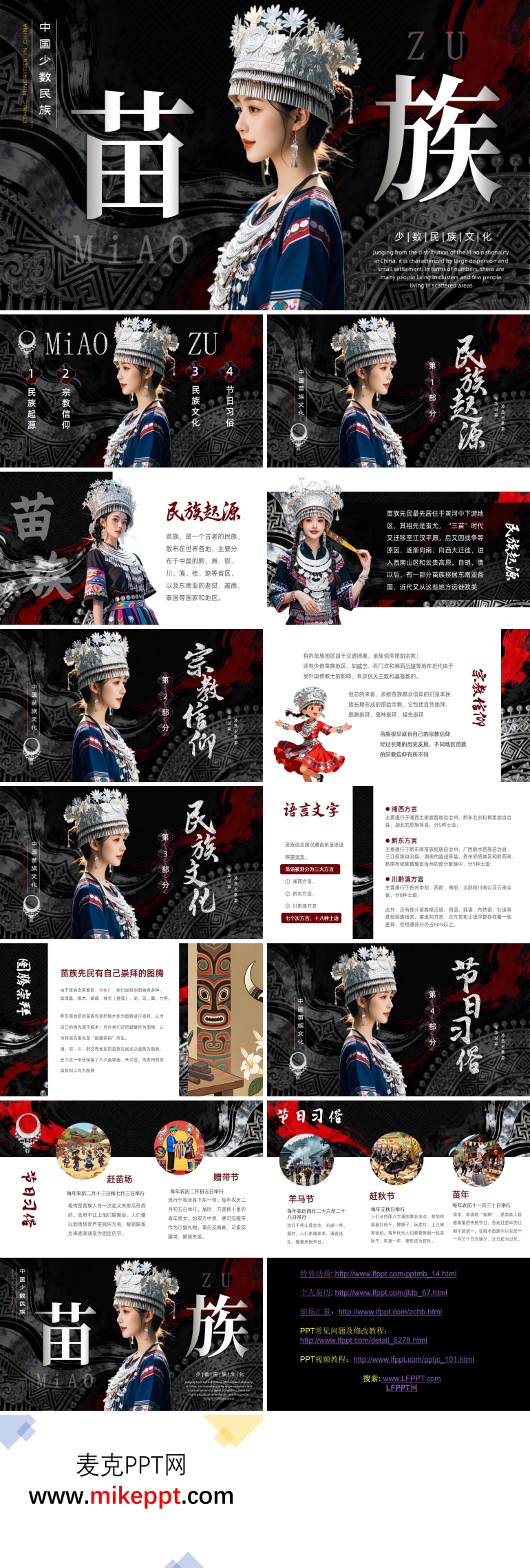 PPT模板内容主要通过PowerPoint软件分四个部分来向我们展开介绍苗族的特色文化让我们全方面的去认识苗族,首先第一部分主要是讲解苗族的民族起源。第二部分介绍了苗族的宗教信仰。第三部介绍了苗族的民族文化,全面了解苗族的文字、语言、图腾的意义等。第四部分则生动的介绍了苗族的节日习俗如踩竹马、芦笙舞等,其中苗年也是苗族一年中最隆重的节日。