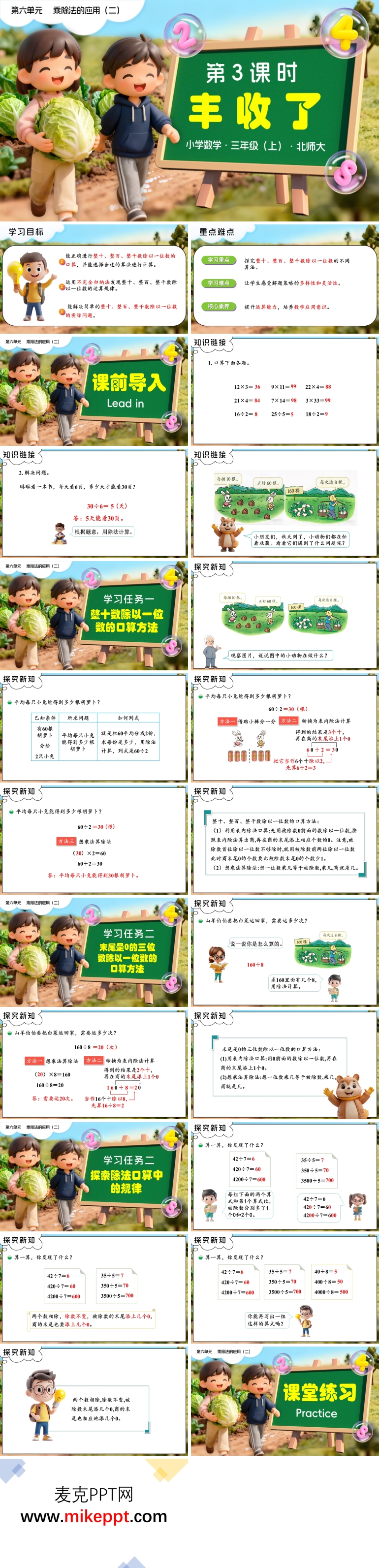 《北师大新教材数学三年级上册第六单元第3课时“丰收了”》PPT课件是一套专为三年级学生设计的数学教学资源,旨在通过贴近生活的“丰收”情境,帮助学生理解整十、整百数除以一位数的算理,并掌握其口算方法。课件共包含30张幻灯片,内容丰富且结构清晰,通过三个主要部分展开本节课的学习。同时,通过观察、操作、讨论等活动,引导学生经历探索整十、整百数除以一位数口算方法的过程,体验算法的多样性,并在这个过程中提高学生的思维能力。 课程设计与目标 本节课以“丰收了”为主题,通过丰收的场景引导学生理解整十、整百数除以一位数的算理。课程不仅注重学生对口算方法的掌握,还通过多样化的活动,帮助学生体验算法的多样性,培养他们的观察力和思维能力。通过本节课的学习,学生能够更好地理解除法运算,掌握口算技巧,并将其应用于实际生活中的简单问题解决。 课程内容与结构 第一部分:整十数除以一位数的口算方法 这一部分通过“丰收了”的生活情境,展示农民伯伯收获水果和蔬菜的场景,引导学生观察图片并找到相关信息,如“一共收获了60个苹果,平均分给3个小组”。通过具体的情境,学生能够直观地理解整十数除以一位数的实际意义。 在计算过程中,课件引导学生逐步总结出整十数除以一位数的口算方法:先将整十数看作几个十,再进行除法运算,最后将结果还原为整十数。例如,60 ÷ 3 可以看作 6 个十除以 3,结果是 2 个十,即 20。通过这种分步引导的方式,学生能够更清晰地理解算理,掌握口算方法。 此外,课件还通过小组讨论和操作活动,鼓励学生分享不同的计算方法,体验算法的多样性。例如,学生可以通过分小棒或画图的方式,直观地展示除法运算的过程,从而加深对算理的理解。 第二部分:末尾是0的三位数除以一位数的口算方法 在掌握了整十数除以一位数的基础上,课件进一步引导学生探索末尾是0的三位数除以一位数的口算方法。通过具体的例子,如“360 ÷ 6”,学生可以发现,末尾有0的三位数除以一位数的计算方法与整十数类似,只是需要处理更多的数位。 课件通过详细的步骤解析,帮助学生总结出:先将末尾的0去掉,将三位数看作几个百或几个十,再进行除法运算,最后在结果末尾添上相应个数的0。例如,360 ÷ 6 可以看作 36 个十除以 6,结果是 6 个十,即 60。通过这种逐步引导的方式,学生能够更好地掌握末尾是0的三位数除以一位数的口算方法。 第三部分:探索除法口算中的规律 这一部分通过几组算式,引导学生观察并总结除法口算中的规律。例如,通过观察“20 ÷ 2 = 10”“200 ÷ 2 = 100”“2000 ÷ 2 = 1000”等算式,学生可以发现,当被除数末尾有0时,除数不变,被除数末尾每增加一个0,商的末尾也会相应增加一个0。 课件通过对比和分析,帮助学生总结规律,并通过练习题巩固这一知识点。通过这种探究式学习方式,学生能够更自然地掌握除法口算的规律,提升数学思维能力。 总结 这套PPT课件通过生动的情境设计和科学的教学结构,为三年级学生提供了一个高效、有趣的学习平台。通过“丰收了”这一贴近生活的情境,学生不仅理解了整十、整百数除以一位数的算理,还掌握了其口算方法,并通过多样化的活动体验了算法的多样性。通过本节课的学习,学生能够更好地理解除法运算,提升思维能力,并将其应用于实际生活中的简单问题解决,为后续的数学学习奠定坚实的基础。
