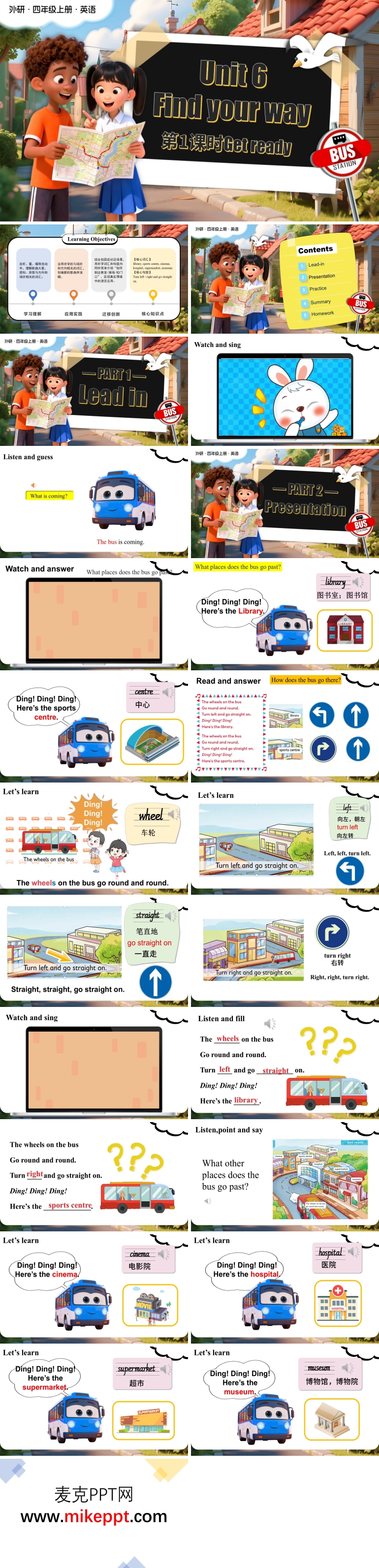 这是一套专为外研版(新教材)英语四年级上册Unit 6 第1课时“Get ready”设计的PPT课件,共包含36张幻灯片。本课件的核心目标是帮助学生掌握核心方位词汇,理解基础指路句型,并通过模拟场景,运用所学知识进行简单的问路与指路,从而提升学生的语言交际能力。整套PPT围绕教学目标,从五个方面展开教学内容,确保学生在不同环节中逐步掌握知识并提升技能。 第一部分是“Lead in”。这一环节通过听、看、唱等多种活动形式,引导学生初步感知与方向和场所相关的词汇。通过富有感染力的歌曲,学生不仅能够理解歌曲大意,还能在轻松愉快的氛围中自然地获取与方位相关的词汇,为后续学习奠定基础。 第二部分是“Presentation”。这一部分通过图片与词汇的匹配训练,强化学生对词汇“形义对应”的认知。同时,结合朗读和跟读活动,纠正学生的发音,帮助学生将语言知识从输入转化为输出。这种形式不仅加深了学生对词汇的理解,还提升了他们的发音准确性,为后续的语言运用打下坚实基础。 第三部分是“Practice”。这一环节通过小组问答的形式,让学生在真实情境中操练核心语言。通过合作学习,学生能够灵活运用所学的方位词和句型进行交流。这种互动性强的学习方式不仅提高了学生的语言交际能力,还培养了他们的团队合作精神和自主学习能力。 第四部分是“Summary”。这一环节对本课时的重点内容进行总结,帮助学生梳理所学知识,巩固记忆。通过总结,学生能够清晰地回顾本节课的核心词汇和句型,进一步加深对知识的理解和掌握。 第五部分是“Homework”。这一环节为学生布置了与本课时内容相关的作业,旨在帮助学生在课后继续巩固和拓展所学知识。通过作业,学生能够将课堂所学应用到实际情境中,进一步提升语言运用能力。 整套PPT设计科学合理,内容丰富多样,通过多种教学活动和互动形式,充分调动了学生的学习积极性。它不仅帮助学生在课堂上掌握核心词汇和句型,还通过模拟场景和合作学习,提升了学生在实际生活中的语言交际能力。这种循序渐进的教学设计,确保学生在不同阶段都能获得有效的学习体验,为他们的英语学习提供了有力支持。
