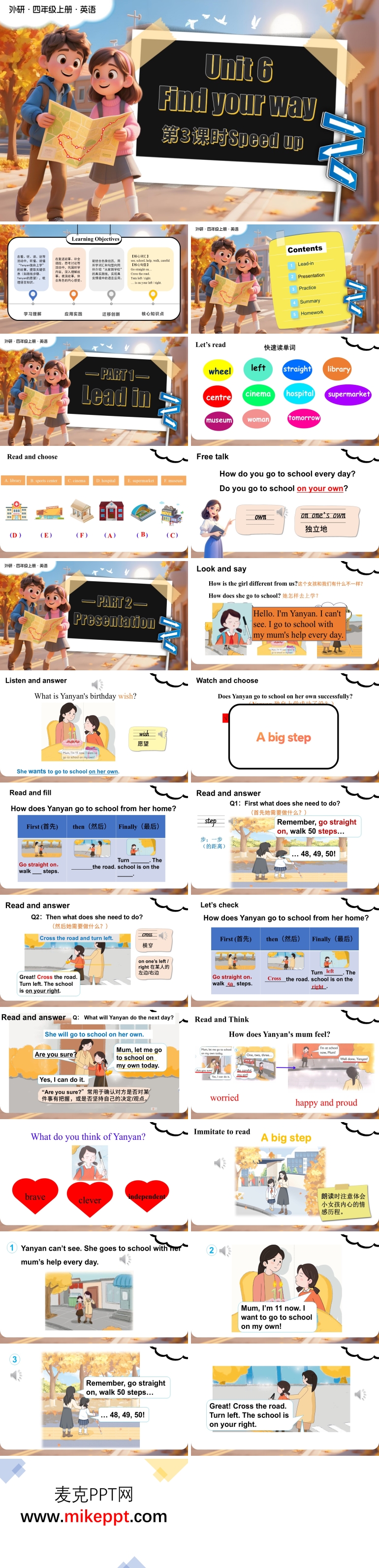 这是一套专为外研版(新教材)英语四年级上册Unit 6 第3课时“Speed up”设计的PPT课件,共包含37张幻灯片。本课件的核心目标是帮助学生积累功能词汇,丰富路线描述的细节,并通过学习培养学生“根据实际情况合理规划路线”的意识。同时,课程还渗透了“安全出行,遵守交通规则”的理念,实现语言学习与生活素养的有机结合。整套PPT从五个方面展开教学内容,确保学生在不同环节中逐步掌握知识并提升技能。 第一部分是“Lead in”。这一环节通过引导学生听懂、读懂“Yanyan独自上学”的故事,激发学生的学习兴趣,同时帮助他们主动获取语言知识。通过故事引入,学生能够自然地接触与路线描述相关的词汇和句型,为后续学习奠定基础。这种情境化的导入方式不仅吸引了学生的注意力,还帮助他们初步感知语言的使用场景。 第二部分是“Presentation”。这一环节通过复述故事,深化学生对语言的情感内涵的理解。同时,通过梳理故事中的路线,强化学生的逻辑思维能力。学生在复述过程中不仅巩固了词汇和句型,还学会了如何有条理地表达复杂的路线信息。这种形式有助于学生更好地理解和运用语言,提升他们的语言表达能力。 第三部分是“Practice”。这一环节鼓励学生结合自身经验,用所学词汇和句型向同伴介绍“从家到学校”的真实路线。通过这种真实情境的模拟,学生能够将课堂所学应用到实际生活中,进一步提高语言能力。这种实践性的练习不仅增强了学生的语言运用能力,还培养了他们的自主学习能力和合作精神。 第四部分是“Summary”。这一环节帮助学生回顾本节课的重点词汇和句型,梳理知识结构。通过总结,学生能够清晰地回顾所学内容,进一步加深对知识的理解和记忆。这种总结方式有助于学生构建完整的知识体系,为后续学习提供坚实基础。 第五部分是“Homework”。这一环节布置了针对性的家庭作业,帮助学生及时回顾和复习课堂所学内容。通过课后作业,学生能够进一步巩固所学知识,查漏补缺,同时将课堂所学应用到实际生活中,提升语言运用能力。 整套PPT设计科学合理,内容丰富多样,通过多种教学活动和互动形式,充分调动了学生的学习积极性。它不仅帮助学生在课堂上积累功能词汇,丰富路线描述的细节,还通过情境模拟和实践练习,提升了学生在真实场景中运用英语的能力。此外,课程还巧妙地渗透了安全出行和遵守交通规则的理念,实现了语言学习与生活素养的有机结合。这种循序渐进的教学设计,确保学生在不同阶段都能获得有效的学习体验,为他们的英语学习和生活素养提升提供了有力支持。