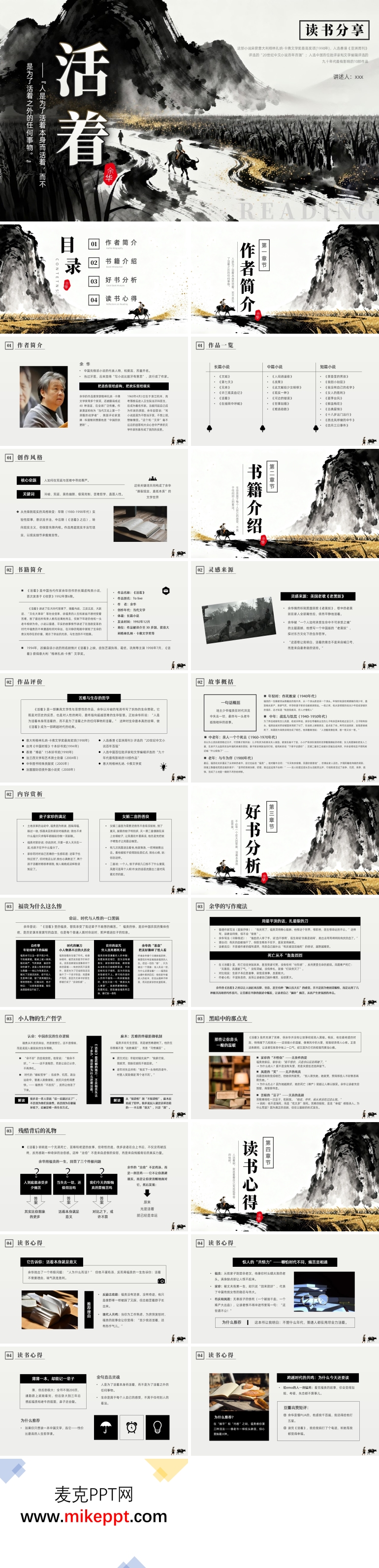 这是一套深度解读余华经典力作《活着》的读书分享PPT模板,通过25张精研细制的幻灯片,引领读者走进一部关于生命韧性与生存哲学的文学圣殿。在快节奏的现代生活中,当人们被焦虑与迷茫裹挟时,《活着》如同一剂清醒良药,告诉我们:无论置身何种时代,平凡人都在以各自的方式用力活着——这份演示文稿正是为了传递这样的精神力量而精心架构。 文稿开篇以"作者简介"奠定根基,不仅勾勒出余华从牙医到作家的传奇履历,更揭示其"零度情感"叙事风格背后对人性深渊的凝视与悲悯。第二部分"书籍介绍"将镜头推向作品本身:这部诞生于20世纪90年代的小说,以福贵跨越半个多世纪的命运沉浮为线索,灵感源于美国民歌《老黑奴》中那份穿透苦难的宁静。从纨绔子弟到孤身老人,福贵目睹所有亲人相继离世,却始终与一头老牛相伴耕耘。文稿通过故事梗概梳理、内容片段精读与权威评价援引,层层剥开"活着"的本质——不是为活着之外的任何事物而活,而是活着本身即是全部意义。 第三部分的"好书分析"堪称精华所在,文稿精选"有庆抽血而亡""凤霞难产""苦根吃豆撑死"等经典场景,以电影镜头般的细腻解析,展现余华如何用克制到冰凉的笔触,让读者在巨大的情感张力中完成对生命重量的体悟。第四部分"读书心得"则将文学体验转化为现实启示:福贵教会我们,当命运将一切剥夺殆尽,人依然可以凭借内心的秩序与尊严站着生存。这种"向死而生"的智慧,对当代青年而言,是缓解生存焦虑、重构价值坐标的重要精神资源。 整套模板以文本细读为经,以生命思考为纬,从文学鉴赏升华至哲学省思,最终引导观众在福贵的故事里照见自己——活着,本就是一场充满尊严的抵抗。