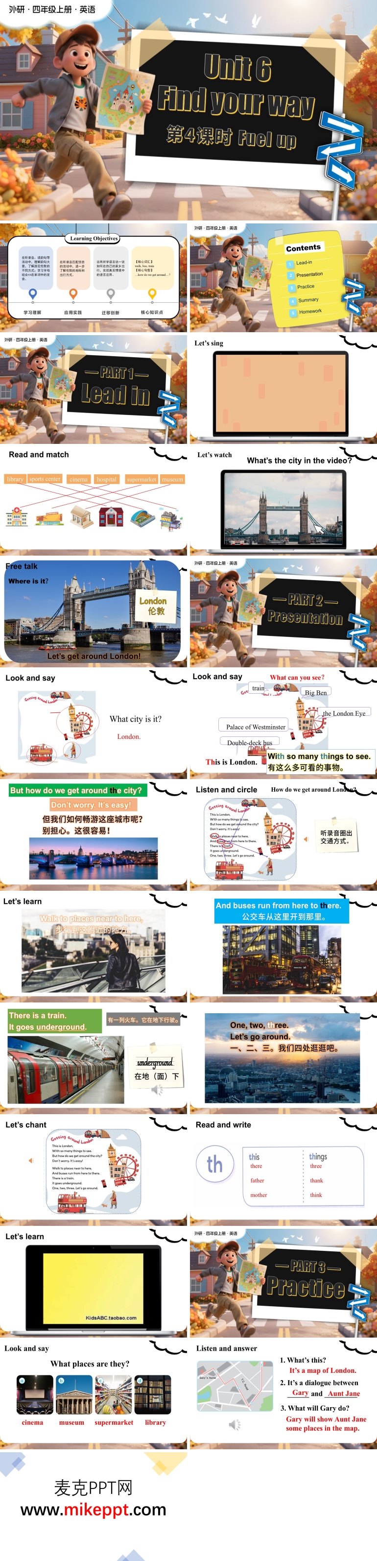 这是一套专为外研版(新教材)英语四年级上册Unit 6 第4课时“Fuel up”设计的PPT课件,共包含40张幻灯片。本课件的核心目标是帮助学生系统回顾本单元的核心知识,包括方位词、地点词汇、功能词汇以及方位介词。通过本课的学习,学生将形成完整的知识网络,并通过真实化的综合场景,自主运用单元知识解决实际问路和指路问题,做到语言流畅、逻辑清晰,从而培养学生的语言表达能力。 整套PPT从五个方面展开教学内容,确保学生在不同环节中逐步巩固知识并提升技能。 第一部分是“Lead in”。这一环节通过听录音、读韵句等活动,引导学生理解韵句大意,了解游览伦敦的不同方式。同时,学生还将学习字母组合“th”在单词中的发音。这种导入方式不仅激发了学生的学习兴趣,还为后续的语言学习和运用奠定了基础。 第二部分是“Presentation”。这一环节通过设计“听力匹配”和“家乡出行交流”等任务,让学生在完成任务的过程中运用语言,提升实践能力。通过听力匹配,学生能够更好地理解语言的细节;而“家乡出行交流”则鼓励学生将所学知识应用到实际情境中,分享自己家乡的出行方式,进一步提升语言运用能力。 第三部分是“Practice”。这一环节通过“家乡出行方式”的讨论,强化学生的逻辑思维能力。学生需要清晰地表达自己的观点,并通过“真实分享”实现知识的迁移。这种练习方式不仅帮助学生巩固了所学知识,还培养了他们将知识应用到实际生活中的能力。 第四部分是“Summary”。这一环节帮助学生回顾本节课的重点内容,梳理知识结构。通过总结,学生能够清晰地回顾本单元的核心词汇和句型,进一步加深对知识的理解和记忆。这种总结方式有助于学生构建完整的知识体系,为后续学习提供坚实基础。 第五部分是“Homework”。这一环节布置了针对性的家庭作业,帮助学生及时回顾和复习课堂所学内容。通过课后作业,学生能够进一步巩固所学知识,查漏补缺,同时将课堂所学应用到实际生活中,提升语言运用能力。 整套PPT设计科学合理,内容丰富多样,通过多种教学活动和互动形式,充分调动了学生的学习积极性。它不仅帮助学生在课堂上系统回顾本单元的核心知识,还通过真实化的综合场景,提升了学生在实际场景中运用英语的能力。这种循序渐进的教学设计,确保学生在不同阶段都能获得有效的学习体验,为他们的英语学习提供了有力支持。