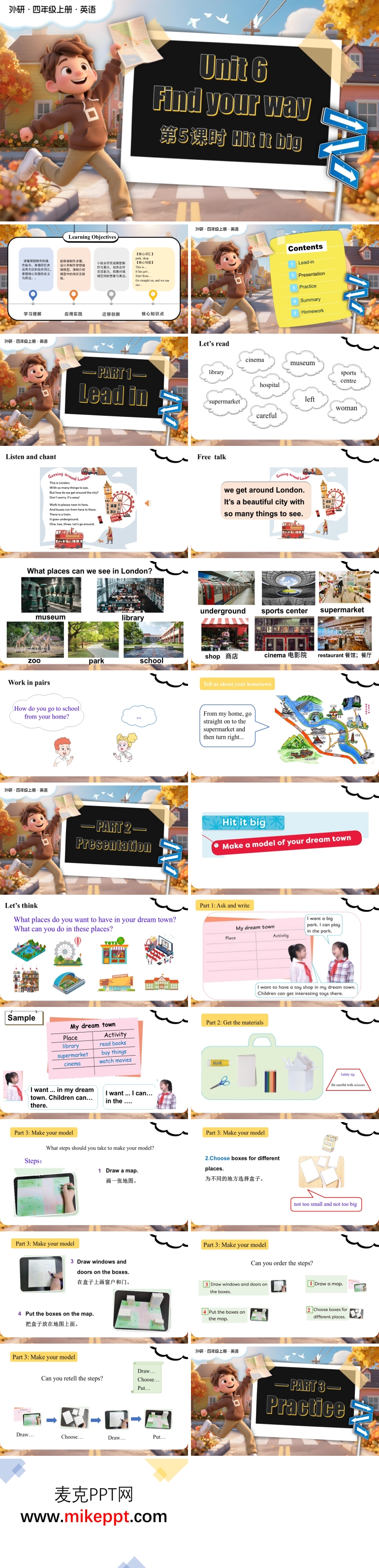 这是一套专为外研版(新教材)英语四年级上册Unit 6 第5课时“Hit it big”设计的PPT课件,共包含29张幻灯片。本课件的核心目标是帮助学生全面掌握本单元的核心知识,查漏补缺,并灵活运用拓展知识,从而拓宽学生的词汇储备。同时,通过完成单元知识检测与创意拓展任务,培养学生的知识迁移能力和创新表达能力。 整套PPT从五个方面展开教学内容,确保学生在不同环节中逐步巩固知识并提升技能。 第一部分是“Lead in”。这一环节通过播放关于伦敦出行的韵句录音,引导学生随录音跟读,复习上一课时的相关词汇与句型。这种导入方式不仅帮助学生快速进入课堂状态,还通过复习巩固了上节课的学习成果,为本节课的学习奠定了坚实基础。 第二部分是“Presentation”。这一环节通过小组合作,让学生完成梦想城镇的制作。学生需要运用本单元所学的方位词、地点词汇和句型,设计并描述自己的梦想城镇。这一任务不仅培养了学生用语言解决问题的能力,还激发了他们的创造力和团队合作精神。通过实际操作和语言运用,学生能够更深入地理解和掌握所学知识。 第三部分是“Practice”。这一环节以小组展示的形式展开,引导学生在真实情境中灵活运用词汇和句型。每个小组通过展示自己设计的梦想城镇,分享其中的路线和地点信息,进一步巩固了语言知识。同时,通过合作学习,学生不仅提升了交际能力,还锻炼了创造性思维和知识迁移能力。这种互动性强的学习方式能够有效激发学生的学习兴趣,增强他们的学习动力。 第四部分是“Summary”。这一环节帮助学生回顾本节课的重点内容,梳理知识结构。通过总结,学生能够清晰地回顾本单元的核心词汇和句型,进一步加深对知识的理解和记忆。这种总结方式有助于学生构建完整的知识体系,为后续学习提供坚实基础。 第五部分是“Homework”。这一环节布置了针对性的家庭作业,帮助学生及时回顾和复习课堂所学内容。通过课后作业,学生能够进一步巩固所学知识,查漏补缺,同时将课堂所学应用到实际生活中,提升语言运用能力。 整套PPT设计科学合理,内容丰富多样,通过多种教学活动和互动形式,充分调动了学生的学习积极性。它不仅帮助学生在课堂上全面掌握单元核心知识,还通过创意拓展任务,提升了学生在实际场景中运用英语的能力。这种循序渐进的教学设计,确保学生在不同阶段都能获得有效的学习体验,为他们的英语学习提供了有力支持。