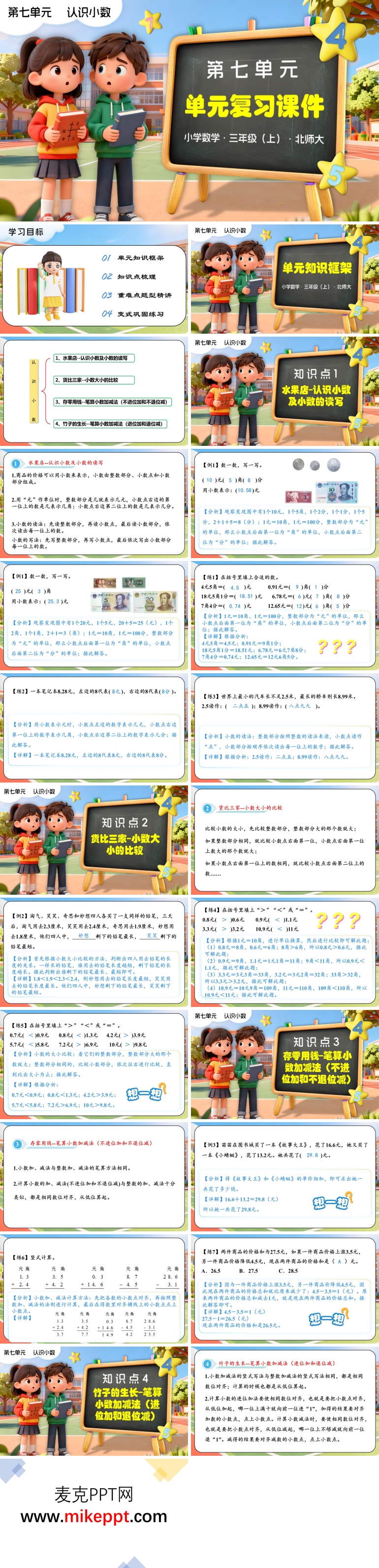 这是一套专为北师大新教材数学三年级上册第七单元“认识小数”设计的单元复习课件,共包含32张幻灯片。本课件的核心目标是帮助学生系统回顾本单元的知识点,通过知识梳理建立完整的知识网络,从而为后续的复习和巩固打下坚实基础。 整套PPT从四个方面展开本节课程的学习,确保学生在不同环节中逐步巩固知识并提升解题能力。 第一部分是“单元知识框架”。这一环节通过思维导图的方式,帮助学生梳理本单元的重点知识,构建清晰的知识网络。思维导图能够将零散的知识点有机整合,使学生在复习时能够快速抓住核心内容,明确各知识点之间的联系。这种系统化的梳理方式不仅有助于学生高效复习,还能为后续的深入学习提供清晰的框架。 第二部分是“知识点梳理”。这一环节对本单元的各个知识点进行详细回顾,包括小数的定义、读写方法、比较大小以及简单的加减运算等。通过逐点讲解,学生能够对每个知识点有更清晰的认识,进一步巩固基础知识。同时,结合具体的例题,帮助学生理解知识点的实际应用,确保学生在复习过程中能够扎实掌握每一个细节。 第三部分是“重难点题型精讲”。这一环节针对本单元的重难点题型进行深入讲解。通过分析典型例题,帮助学生理清解题思路,建立解题框架。例如,对于小数的比较大小和加减运算,课件通过详细的步骤解析,引导学生掌握正确的解题方法。这种针对性的讲解不仅帮助学生突破学习难点,还能提高他们解决实际问题的能力,增强学习信心。 第四部分是“变式巩固练习”。这一环节通过多样化的练习题,帮助学生加强对知识点的理解和应用。练习题设计注重变式,从不同角度考查学生对知识点的掌握情况。同时,教师可以通过学生的练习情况,及时了解学生对知识点的掌握程度,从而制定更具针对性的复习方案。这种以练促学的方式,能够有效巩固学生的知识体系,提升综合应用能力。 整套PPT设计科学合理,内容丰富多样,通过多种教学形式和互动环节,充分调动了学生的学习积极性。它不仅帮助学生在课堂上系统回顾本单元的知识点,还通过重难点题型的精讲和变式练习,提升了学生解决实际问题的能力。这种循序渐进的教学设计,确保学生在不同阶段都能获得有效的学习体验,为他们的数学学习提供了有力支持。