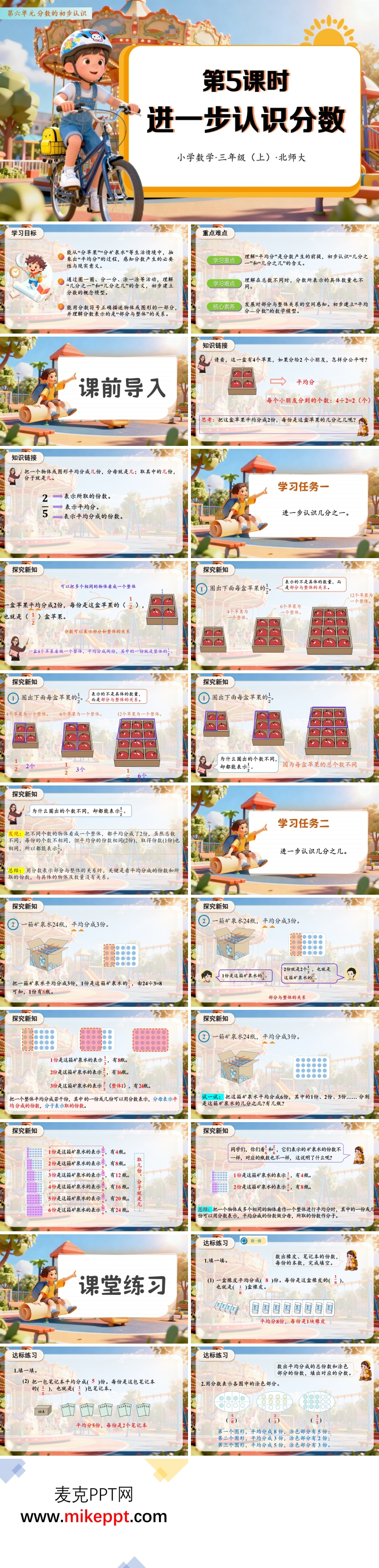 这套与人教版三年级上册第六单元第05课时《进一步认识分数》配套的30页演示文稿,是在学生已能读写简单分数、会比较同分母大小的基础上,再次把“分数”这一概念往“本质”深处推进。整节课教师以“一条巧克力、一张披萨、一盘水果”等熟悉场景作载体,通过“看—折—涂—说—比”五连活动,让学生亲手把整体平均分成若干份,再取其中一份或几份,从而经历“具体→半具体→抽象”的完整建构过程:他们先借助学具把“1”平均分成2份、4份、8份,直观看到1/2、2/4、4/8虽然“名字”不同却“大小”相等,初步渗透等价分数;再过渡到线段图、面积模型,学会用“分子”“分母”精准描述“取了谁的几份”;最后把目光投向生活,发现“牛奶盒上的1/2、公交站的3/4路线、爸爸喝了2/5壶茶”都是分数的“身影”,真正把数学眼光从课堂延伸到校外。课件五大板块层层递进:目标与重难点先行,让学生带着“我会说、我会写、我会用”的任务出发;课前导入用“知识接龙”激活旧知,扫清认知障碍;学习任务分“再识几分之一”“再识几分之几”两步走,既巩固基础又拔高思维;课堂练习《填一填》《算一算》即时检测,及时补救;知识总结与课后作业首尾呼应,引导学生把课堂收获迁移到“记录自己一天遇到的分数”实践活动中,实现“学—思—用”一体化,落实核心素养。