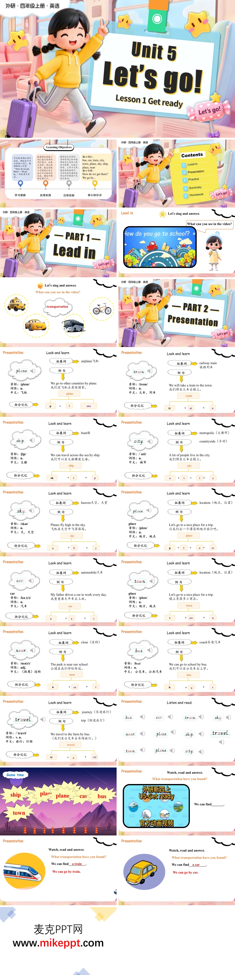这是一套专为四年级英语上册外研版 Unit 5 第 1 课时 “Get ready” 设计的 PPT,共包含 38 页。本节课通过丰富多样的课堂活动,如游戏互动、情景模拟和小组合作等,充分调动学生的学习积极性。通过这些活动,学生能够在具体的课堂场景中灵活运用核心词汇和句型,进行准确而简单的英文交流,从而有效提升他们的语言表达能力。同时,借助图片或实物的提示,学生能够学会将交通方式词汇与相应的场景进行匹配,这不仅锻炼了他们的观察力,还培养了他们的联想能力。此外,课堂小游戏的设计旨在激发学生对英语学习的兴趣,增强他们的学习自信心,让学习过程变得更加轻松愉快。 这份 PPT 共分为五个部分。第一部分是课堂导入环节,此环节通过播放一段英文视频吸引学生的注意力,并对视频内容进行简要呈现,帮助学生快速进入学习状态,为后续的学习做好铺垫。 第二部分是知识呈现环节。这一部分通过多种方式讲解重点词汇,包括展示拓展词汇、例句以及拆分记忆的方法。通过这些方法,学生能够更系统地掌握词汇用法,加深对单词的理解和记忆,为后续的语言运用打下坚实基础。 第三部分是练习与巩固环节。这一部分一方面展示了本节课的语言知识点,帮助学生梳理重点内容;另一方面通过词汇填空和句子翻译的练习,进一步巩固学生对所学知识的掌握。这些练习形式多样,能够满足不同层次学生的学习需求,帮助他们更好地应用所学知识。 第四部分是知识小结环节。这一部分对本节课的核心词汇和句型进行系统总结,帮助学生梳理知识脉络,构建完整的知识体系。通过回顾和总结,学生能够更清晰地掌握本节课的重点内容,为后续的学习做好准备。 第五部分是作业布置环节。教师根据本节课的学习目标,设计了有针对性的作业,旨在帮助学生在课后继续巩固所学知识,拓展学习内容,进一步提升他们的英语综合能力。 总之,这套 PPT 通过精心设计的导入、知识讲解、练习巩固、小结和作业布置等环节,结合多样化的教学活动,能够有效激发学生的学习兴趣,提升他们的语言表达能力和学习自信心,是一套实用且富有创意的教学资源。