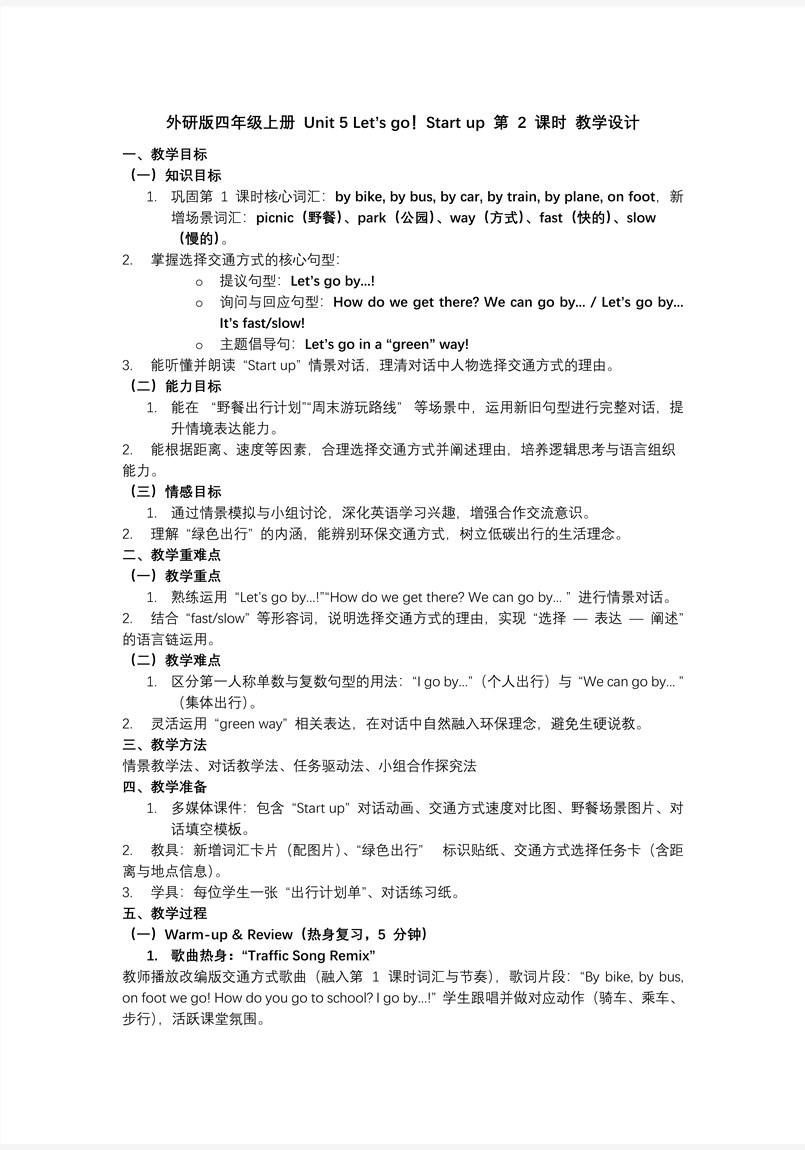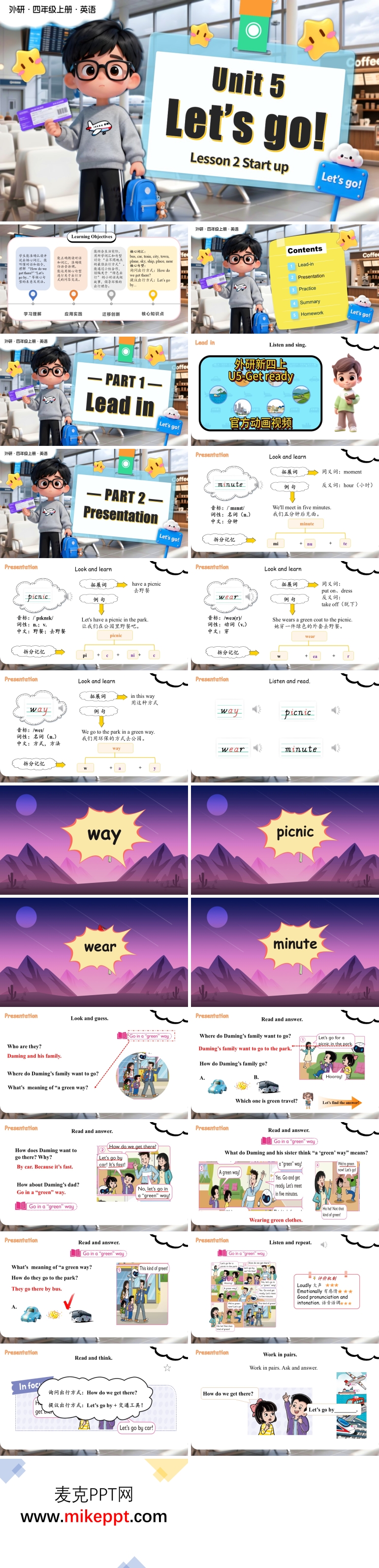 这是一套针对四年级英语上册外研版 Unit 5 第 2 课时 “Start up” 的演示文稿,共包含 36 张幻灯片。在本节课的教学中,教师巧妙地运用了多种教学方法,如情境教学法、对话教学法和小组合作探究法,以丰富多样的形式引导学生学习。通过创设“野餐出行计划”这一生动的课堂场景,学生被要求运用所学句型进行完整的英文对话,从而在实际语境中锻炼语言表达能力。同时,课程设计还注重培养学生的逻辑思考能力,引导他们综合考虑距离、速度等多种因素,选择合适的交通方式并清晰地阐述理由。这种教学设计不仅提升了学生的语言运用能力,还帮助他们在实践中发展思维能力。 这份演示文稿分为五个部分。第一部分是课堂导入环节,通过播放一段动画视频吸引学生的注意力,激发他们的学习兴趣,为后续的学习内容做好铺垫。动画视频以其生动的画面和有趣的情节,能够迅速调动学生的情绪,使他们主动参与到课堂活动中。 第二部分是知识呈现环节。这一部分首先对重点单词进行详细讲解,帮助学生掌握单词的发音、拼写和基本含义。接着,通过设计单词小游戏,进一步巩固学生对单词的记忆,让学习过程变得更加轻松有趣。最后,教师引导学生看图回答问题,并结合课文内容进行讲解,帮助学生更好地理解课文语境和语言点。 第三部分是练习与巩固环节。这一环节通过多样化的练习形式,帮助学生进一步巩固所学知识。练习内容包括单词的英汉互译,帮助学生加深对单词的理解;句子翻译,锻炼学生将英语句子转化为汉语的能力,同时加深对句型结构的理解;以及选择填空,通过具体的语境考查学生对单词和句型的灵活运用能力。这些练习形式多样,能够满足不同层次学生的学习需求,帮助他们更好地掌握本节课的重点内容。 第四部分是知识小结环节。在这一部分,教师对本节课的核心词汇和句型进行系统总结,帮助学生梳理知识脉络,构建完整的知识体系。通过回顾和总结,学生能够更清晰地掌握本节课的重点内容,为后续的学习做好准备。 第五部分是作业布置环节。教师根据本节课的学习目标,设计了有针对性的作业,旨在帮助学生在课后继续巩固所学知识,拓展学习内容,进一步提升他们的英语综合能力。 通过精心设计的课堂导入、知识呈现、练习巩固、知识小结和作业布置等环节,结合情境教学、对话练习和小组合作等多种教学方法,这套演示文稿能够有效激发学生的学习兴趣,提升他们的语言表达能力和逻辑思维能力,是一套实用且富有创意的教学资源。