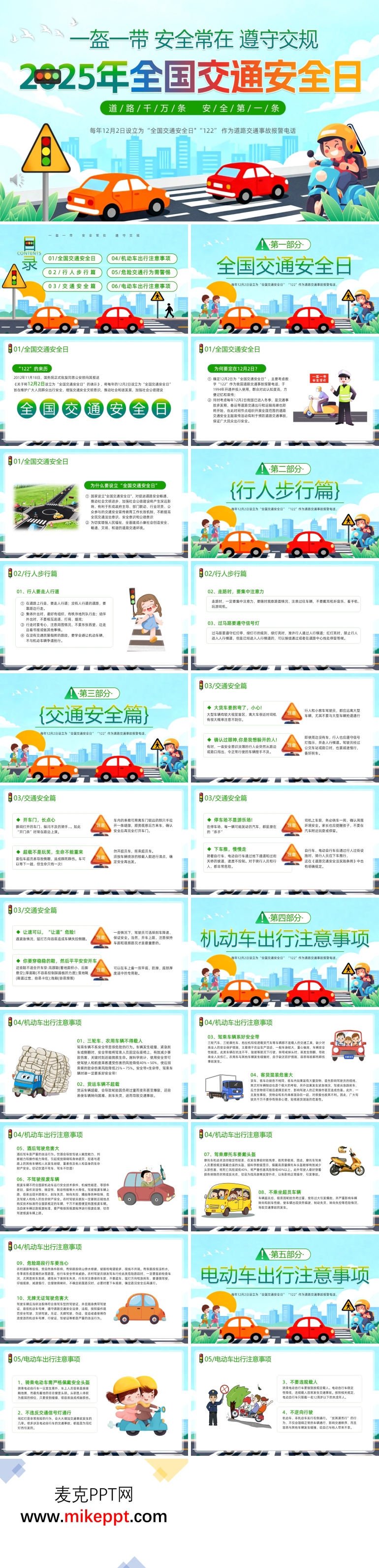 本套 2025 年全国交通安全日 PPT 模板以 PowerPoint 为制作工具,共包含 30 张幻灯片,通过系统化的内容架构,聚焦交通安全核心议题,旨在强化公众交通规则意识,减少因违规行为引发的交通事故。据统计,我国每年因交通事故造成的人员伤亡和财产损失数额惊人,而数据显示,超过八成的交通事故源于交通参与者不遵守规则,其中绝大多数属于可预防的人为事故。基于这一现实痛点,模板围绕六大核心板块展开,构建起全面且具针对性的交通安全知识体系。 第一板块聚焦全国交通安全日的 “根源解析”,深入追溯节日的设立背景与发展历程,系统阐释设立初衷 —— 不仅是为了固化交通安全宣传教育的时间节点,更在于通过常态化传播,唤醒全民交通法治意识、安全意识和文明意识,从思想根源上筑牢交通安全防线。 第二板块为 “行人步行安全指南”,作为交通参与者中最易受伤害的群体,行人安全被置于重要位置。内容以 “基础规则 + 行为规范” 为核心,明确要求行人必须走人行道、过街设施,强调步行时禁止玩手机、打闹等分心行为,着重解读交通信号灯、人行横道的通行规则,通过具象化的指引规避步行中的高频风险。 第三板块以 “大车辆安全警示” 为主题,直击 “大车盲区” 这一高频事故诱因。板块同时面向行人和小客车驾驶员两类群体,详细科普大货车、工程车等大型车辆的内轮差、后视镜盲区范围,明确 “保持安全距离” 的具体标准,警示两类群体避免在大车转弯、倒车等关键场景中近距离停留。 第四板块聚焦 “机动车出行规范”,针对不同车型和驾驶行为制定细分准则。其中特别强调三轮车、农用运输车的载人禁令,明确货运车辆超载的法律后果与安全危害;同时将 “全程系好安全带” 作为核心要求,延伸覆盖儿童安全座椅的正确使用、禁止酒驾醉驾等基础规则,形成全场景驾驶规范。 第五板块专门针对电动车出行安全,贴合当下电动车普及的社会现状。内容涵盖佩戴安全头盔、不逆行、不闯红灯、不违规载人载物等核心要求,特别提醒电动车驾驶员注意夜间行车灯光使用、避开大型车辆盲区,同时明确电动车登记上牌、定期检修等管理规范,填补细分车型的安全知识空白。 第六板块以 “危险交通行为警示” 收尾,通过案例分析与风险拆解,聚焦酒驾醉驾、超速超员、分心驾驶、行人乱穿马路等高发危险行为,揭示其背后的安全隐患与法律代价,强化 “安全第一” 的出行理念,形成从规则普及到风险警示的完整传播闭环。