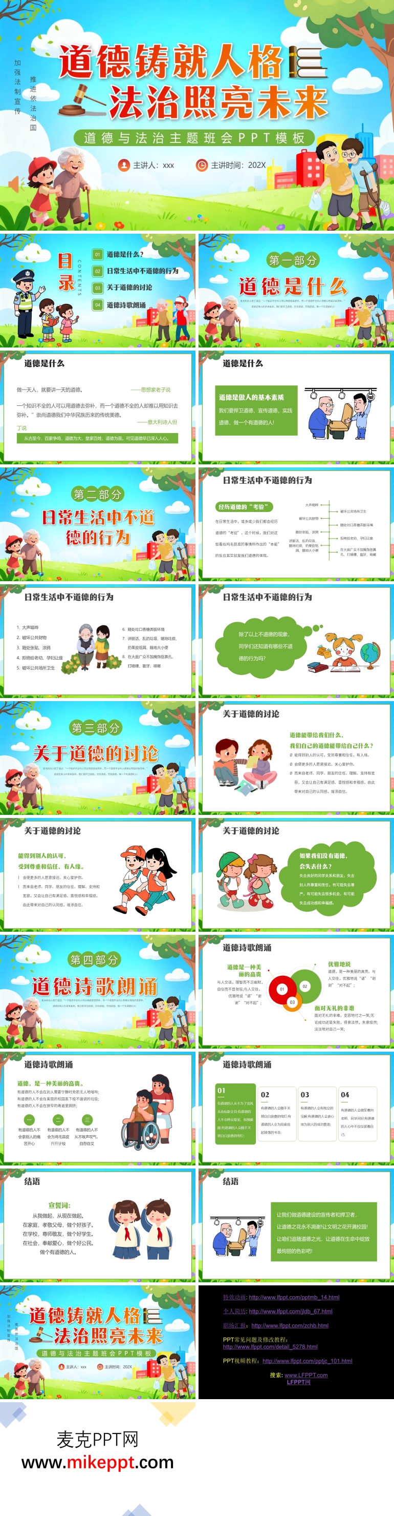 这套题为"道德铸就人格,法治照亮未来"的主题班会PPT,以20张精心设计的幻灯片为载体,系统构建起小学德育课堂的生动框架。在教育理念中,"德"字居于五育之首,足见德育在青少年成长中的奠基性作用。道德与法治作为基础教育的重要学科,承载着培育合格公民的神圣使命,要求教师以高度的责任感将每一堂课都打造成涵养品格、塑造人格的精神驿站。 课件内容架构严谨,层层递进:首板块从哲学层面诠释道德的本质内涵,将抽象概念转化为儿童可理解的语言,为孩子们建立正确的价值坐标系;第二板块聚焦校园与日常生活的真实场景,通过列举大声喧哗、破坏公物、污染环境、乱涂乱画等具体行为,引导学生明辨是非,在反思中唤醒道德自觉;第三板块创设思辨空间,以"道德赋予我们什么"与"缺失道德我们将失去什么"为叩问,激发学生深度思考,在价值辨析中强化道德认同;第四板块则以诗歌朗诵的艺术形式,让道德教育浸润心灵,在韵律与意境中实现情感的升华与内化。整套课件融知识性、实践性与审美性于一体,既捍卫道德底线,又播撒法治之光,为培养知行合一、德法兼修的新时代少年提供了优质教学资源。