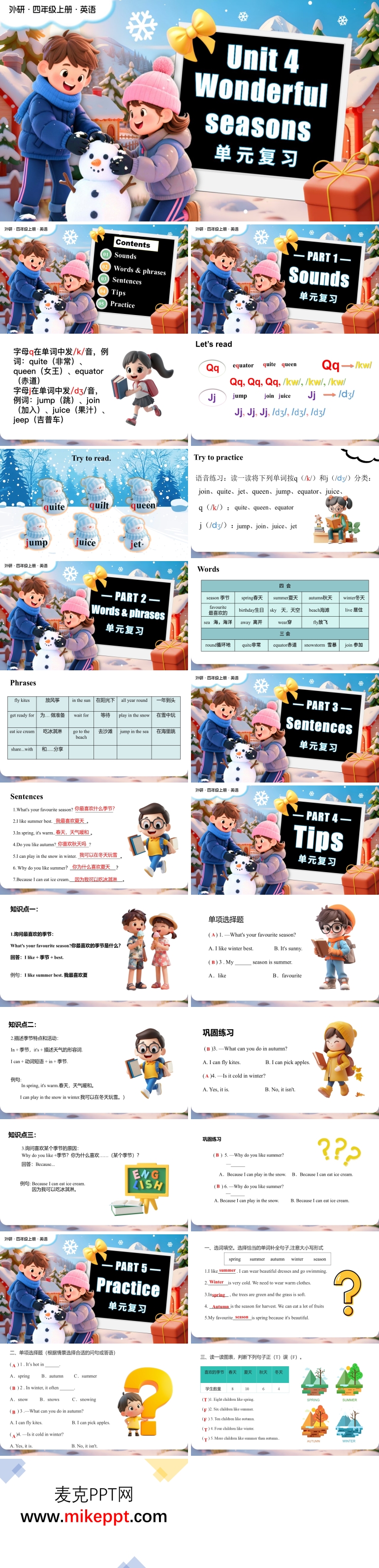 这是一套专为外研版(新教材)英语四年级上册Unit 4 Wonderful seasons(复习课件)设计的PPT课件,共包含25张幻灯片。本节课的核心目标是帮助学生系统复习本单元所学的核心词汇和关键句型,并通过具体情境的创设,提升学生在实际生活中的口语表达能力,使学生能够更加熟练地运用所学知识进行交流。 该套PPT从五个方面展开Unit 4的复习课程。第一部分是Sounds(发音练习)。通过音频材料,带领学生复习英语单词的正确读音。特别地,设计了单词朗读环节,重点帮助学生练习字母“q”和“j”的发音。这一环节不仅巩固了学生的发音基础,还通过反复练习,帮助学生纠正发音错误,为后续的语言学习打下坚实基础。 第二部分是Words and phrases(单词与短语)。这一部分系统回顾了本单元的核心单词和短语。通过分类整理和反复呈现,帮助学生加深对词汇的记忆和理解。同时,结合实际例句,让学生在语境中体会单词和短语的用法,进一步强化记忆,为口语和书面表达提供词汇支持。 第三部分是Sentences(句型练习)。通过翻译练习的形式,帮助学生回顾本单元的重点句型。学生需要将中文句子翻译成英文,这一过程不仅检验了学生对句型的掌握程度,还培养了学生的语言转换能力。通过对比中英文表达的差异,学生能够更好地理解和运用这些句型,从而提升语言运用的准确性和流利性。 第四部分是Tips(知识要点回顾)。这一部分对本单元的重点知识进行了系统的回顾和总结。通过梳理知识点,帮助学生构建知识体系,使学生能够清晰地了解本单元的核心内容。同时,针对学生在学习过程中容易出现的错误和难点,进行了详细的讲解和提示,帮助学生查漏补缺,进一步巩固所学知识。 第五部分是Practice(练习)。通过多样化的练习形式,帮助学生加强对知识点的理解和应用。练习内容涵盖了词汇、句型、阅读和写作等多个方面,旨在通过综合训练,提升学生的英语综合运用能力。练习题的设计注重实践性和应用性,引导学生将所学知识运用到实际情境中,培养学生的思维能力和语言表达能力。 整套PPT的设计注重系统性和实用性,通过多种教学手段和方法,帮助学生在复习过程中巩固知识、提升能力。课程结构清晰,内容丰富,既注重基础知识的梳理,又注重知识的拓展和应用。通过本节课的学习,学生不仅能够系统复习本单元的知识,还能在实际情境中灵活运用所学内容,为后续的英语学习奠定坚实基础。